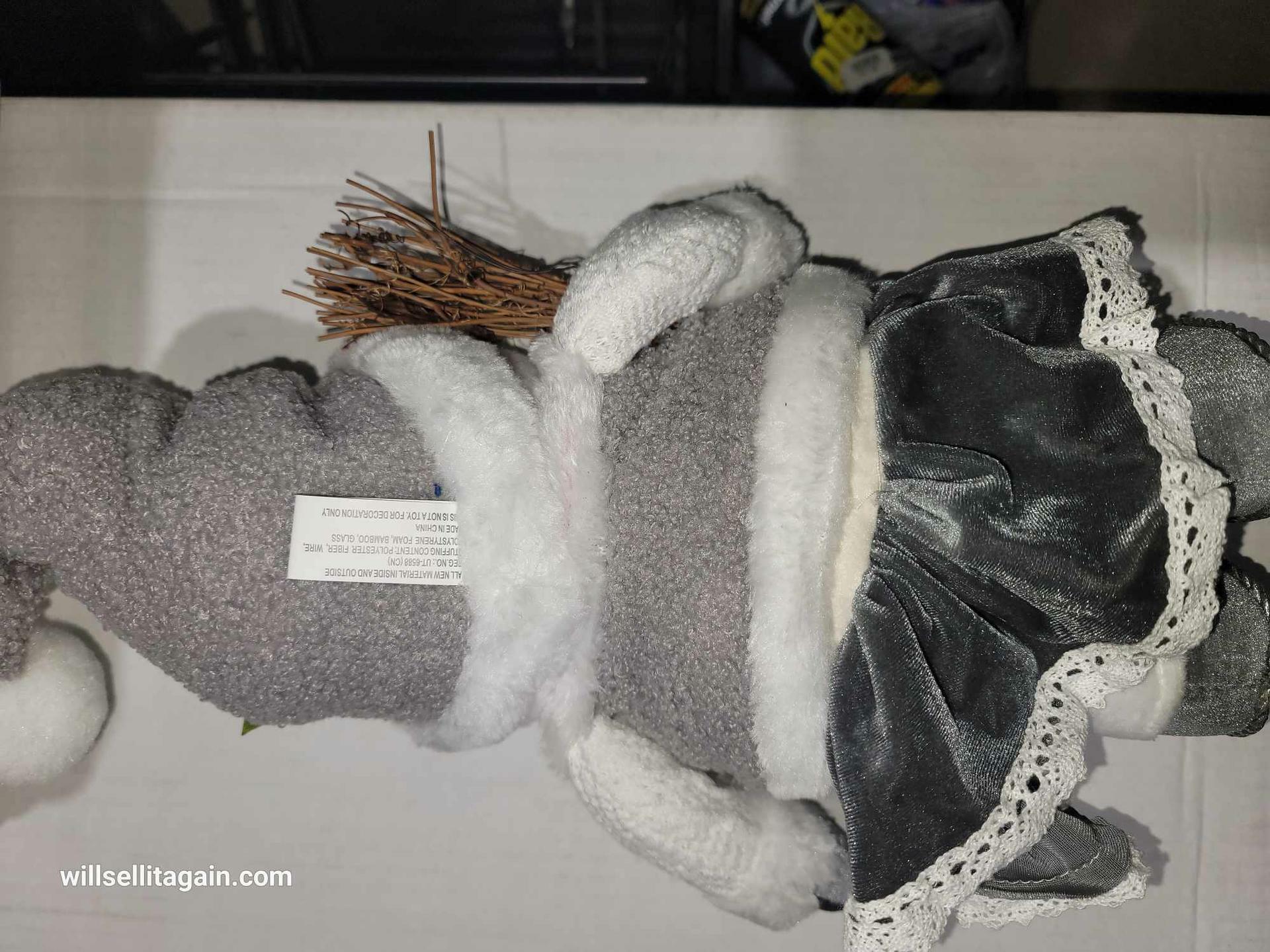12 in Lady Snowman Standing Plush FigureThis cute little lady is wearing her Christmas best a beautiful Silver and cream colored dress with a Gray and fur vest. She is wearing her Gray Christmas hat and carrying a broom. A must have for your holiday decorations.