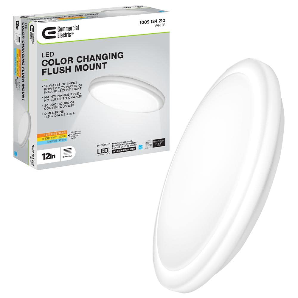 Brighten your home or office with Commercial Electric 12in. White Round LED Flush Mount Ceiling Light by replacing your outdated incandescent lights with an energy-efficient integrated LED fixture. With its low-profile design, this traditional ceiling light can be installed in spaces with low ceiling clearance and seamlessly flush into your ceiling aesthetic. Prior to installation, adjust the color temperature between Soft White, Bright White or Daylight depending on your needs and it is dimmable. While emitting 1100 Lumens of brightness, the smooth frosted lens produces crystal-clear even light distribution with no yellowing, discoloration, or dark spots over time. This flush mount offers a premium LED light engine ensuring maintenance free service with no bulbs to replace. Ideal for kitchen, laundry room, bathroom, bedroom, basement, office, corridors/hallways, and retail spaces and so much more.