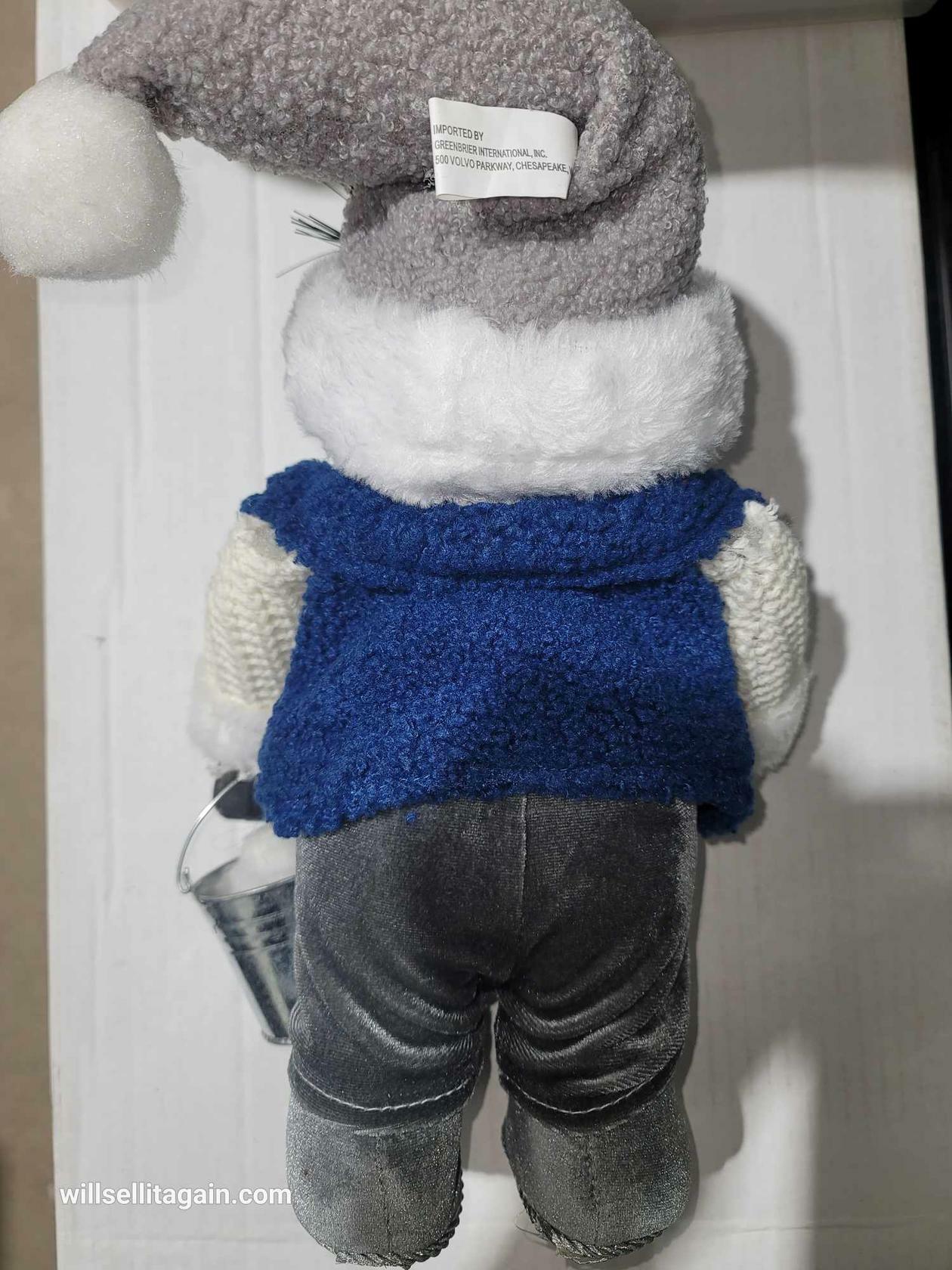 12 in Male SnowmanThis handsome snowman is wearing silver pants and has on a cream colored sweater and a blue vest. He is wearing his Christmas Hat and carrying a bucket filled with snowballs. He has a snowball in his hand ready to throw it at the next person. He is a must have for any holiday decorations