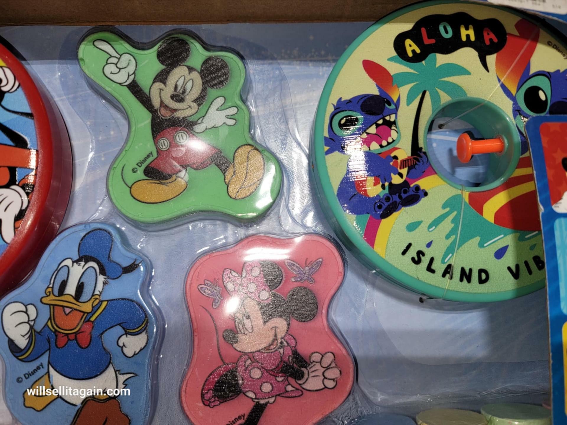 The Disney Fun Pack 14-piece set includes a combination of water squirters and sidewalk chalk, featuring popular Disney characters like Stitch, Disney Princesses, and Mickey and Minnie Mouse. The set is designed to provide hours of fun for kids, combining outdoor play and creativity.