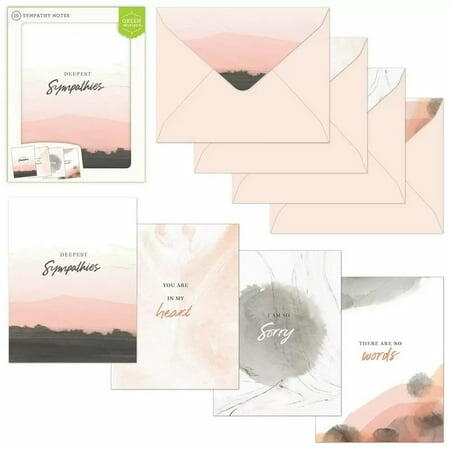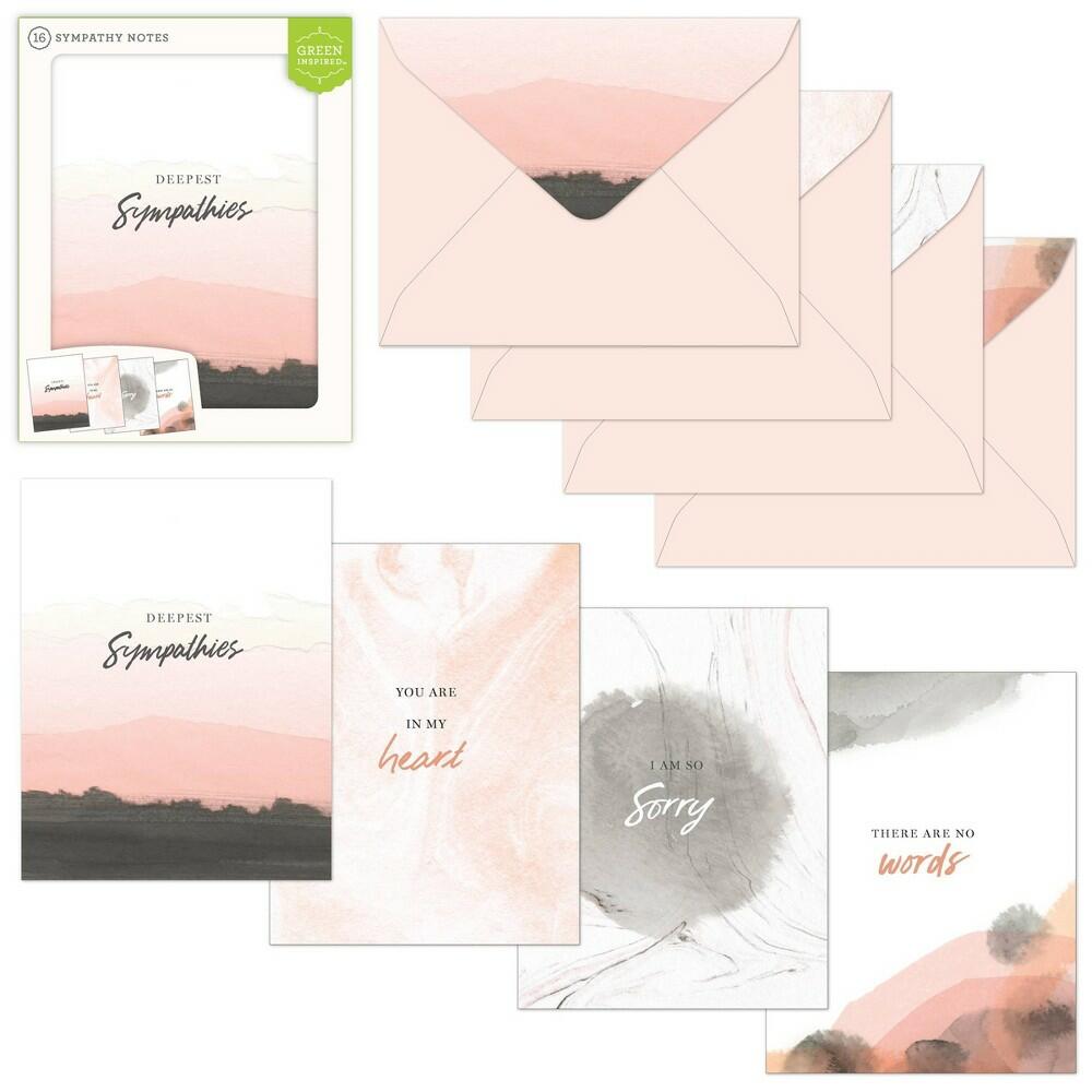 This is an assorted boxed set of 16 sympathy cards. Includes 4 unique card designs, each featuring a soft, abstract image with a sympathy statement. Also includes 4 unique printed envelope colors to match with each card design. The four sympathy statements are: Deepest Sympathies You are in my heart I am so sorry There are no words Designed in the USA, printed in China. This product is recyclable. Printed on FSC-Mix Certified Paper with soy inks on chlorine-free paper. FSC Mix means the wood within the product comes from FSC certified forests, recycled materials, and/or controlled wood. Pattern: letters.