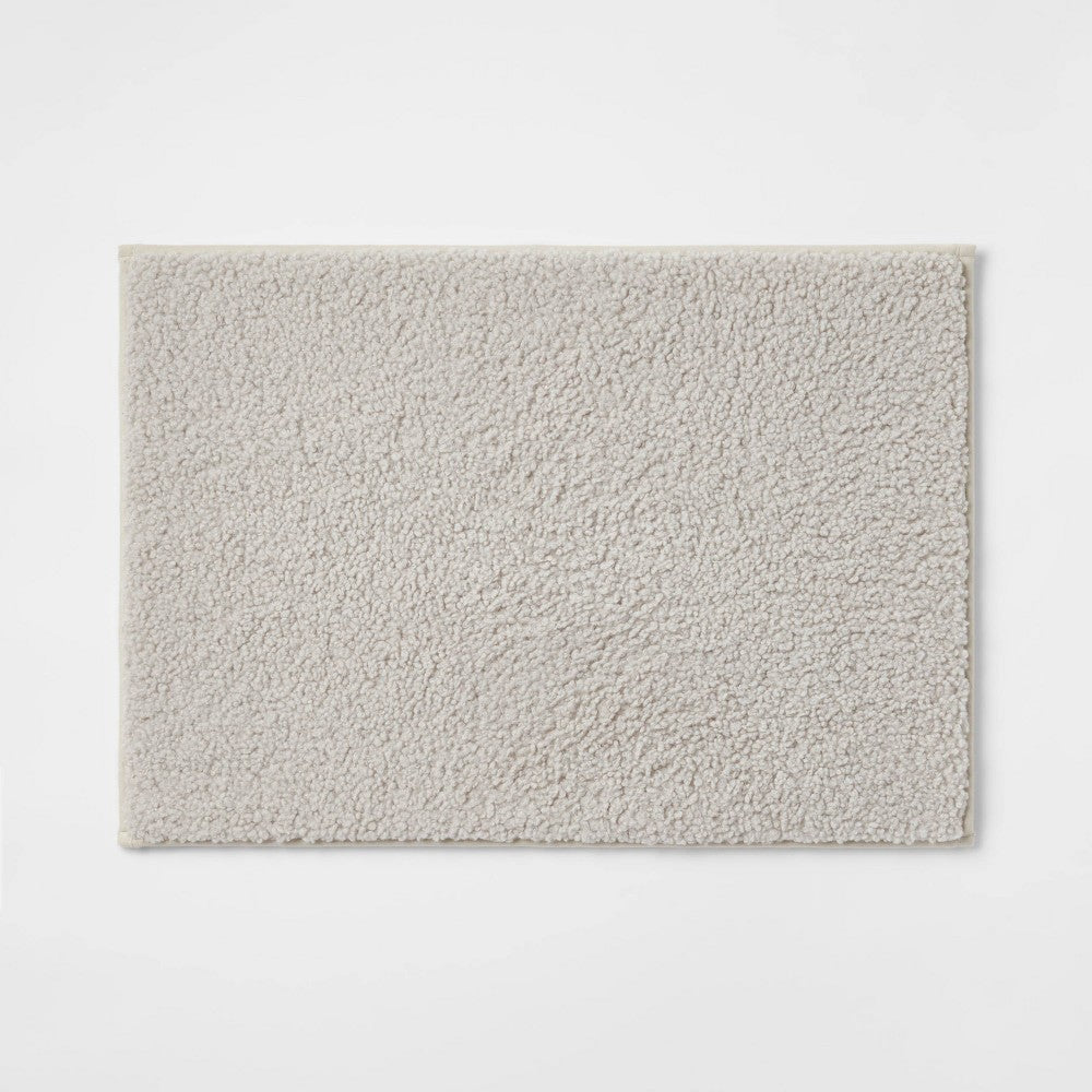 Lend your powder room or shower stall a welcome touch of texture with this Boucle Memory Foam Bath Rug from Room Essentials?. The knitted bath rug features a boucle texture that feels great on your feet, while its ultra-absorbent material protects your floors from dripping water while you're stepping out of the shower or getting ready by the sink. Featuring a simple knitted design in a solid hue, this bath rug easily blends with your existing decor, while the machine-washable design makes for easy maintenance. Size: 17"x24". Color: Light Gray.