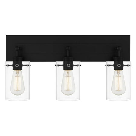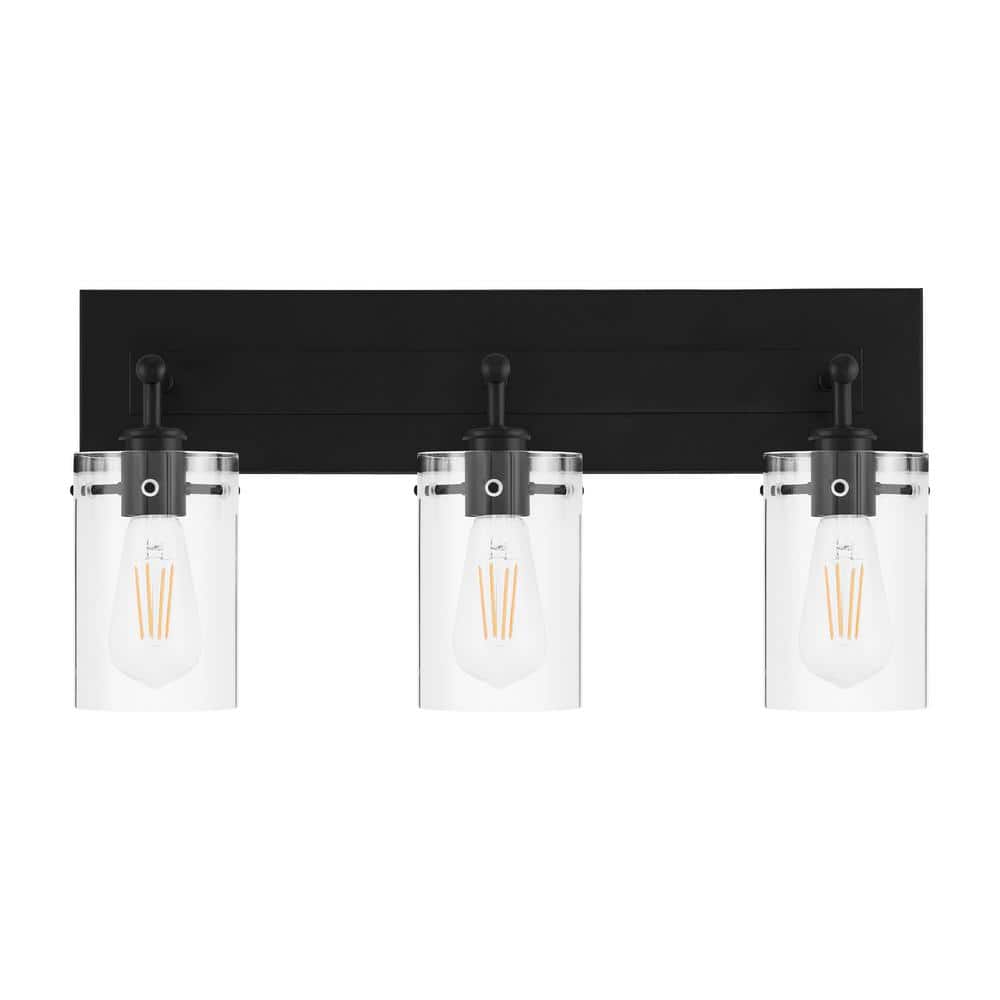 UPC: 802513196153 ASIN: Title: Hampton Bay Regan 21 in. 3-Light Matte Black Bathroom Vanity Light with Clear Glass Shades Manufacturer: Hampton Bay Other Description: Add a touch of contemporary industrial style to your bathroom with this matte black bath light. This light features 3 cylinder clear glass shades with open bottoms exposing the bulbs inside. Define your living space with the handsome look of this transitional bath light.