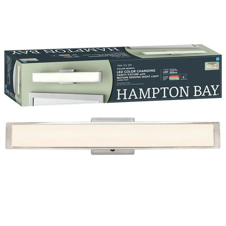 Hampton Bay Collier Heights 24 in. Chrome Curved Selectable LED Bathroom Vanity Light Bar Flush Mount with Night Light Feature Collier Heights 24in. LED Color Changing Curved Vanity Light fixture with Motion Sensing Night Light displays the perfect combination of simple Modern design sleek Chrome finish with a gently curved acrylic lens complemented with energy-efficient LED technology. This innovative fixture is simple to customize the light output motion sensor with Night Light feature by using slide switches on the back of the fixture. Choose between 3 colors of light output: Warm White Soft White or Daylight depending on your needs of the space. The motion sensor has 3 options: Disable mode which disables motion sensor and allows the Night Light to remain on constantly 5min or 15min after the last motion is detected then turns off. Our vanity emits crystal clear 1650 Lumens of brightness using only 20-Watt of electricity. With our premium LED light engine this fixture is long-lasting and maintenanc