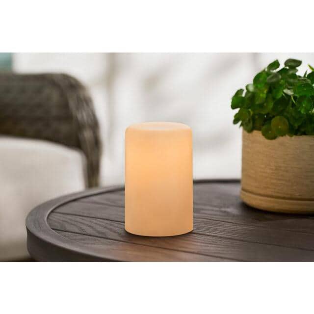 Give your outdoor space ambient lighting with this Hampton Bay Fireglow Candle. Unlike a regular candle, this flameless design will last you over time without needing to replace it, plus it's safe. This candle includes a remote for on/off function and batteries. Color: White.