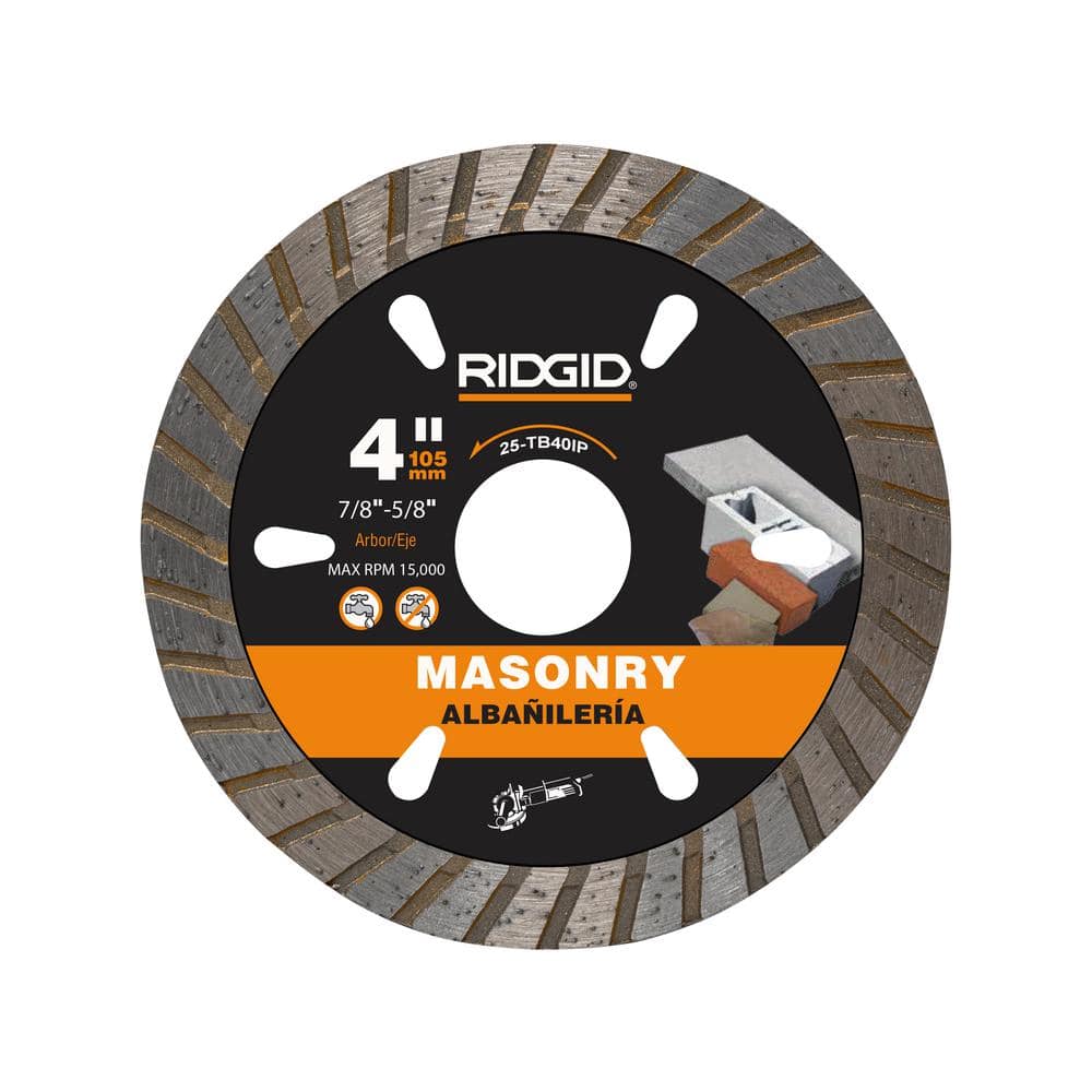 RIDGID Turbo Diamond Blades are manufactured with the contractor in mind. These blades are engineered for maximum cutting performance and 3x longer life than standard abrasive blades. The Turbo rim design provides fast, clean, and accurate cuts on stone, brick, block, and concrete. It's also an excellent choice for roof tile and other masonry products. Use this blade on 4 in. or 4.5 in. angle grinders with 7/8 in. arbor, 5/8 in. and 20mm adapters included.