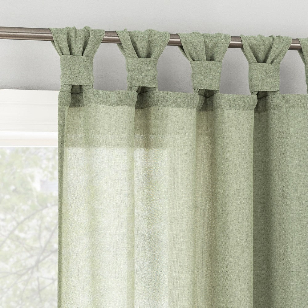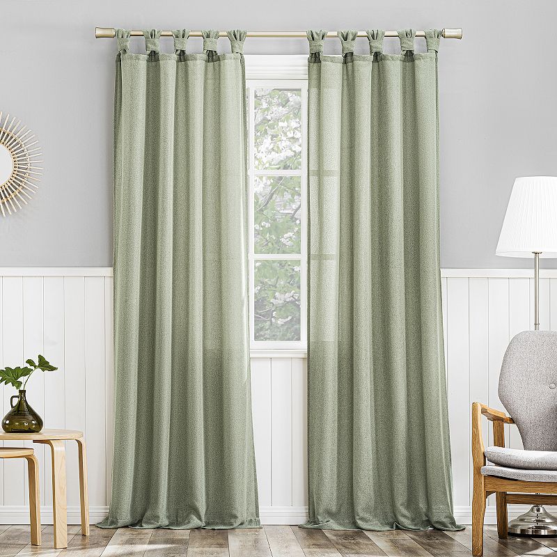 This handsome curtain is classic good looks with a twist. Hathaway Curtain Panels from No. 918 add personality with a unique twist tab top design reminiscent of the beloved bow tie. The textured semi-sheer fabric gently filters light while enhancing privacy. Tab top design allows for simple slide-through installation on curtain rods up to 1 ?" in diameter. Sold as individual panels measuring 40" width by 96" length in color sage green. Measure carefully before selecting your desired size and quantity. Rod not included. Machine wash cold on gentle cycle. Use non-chlorine bleach when needed. Tumble dry on low heat, using a cool iron as needed.