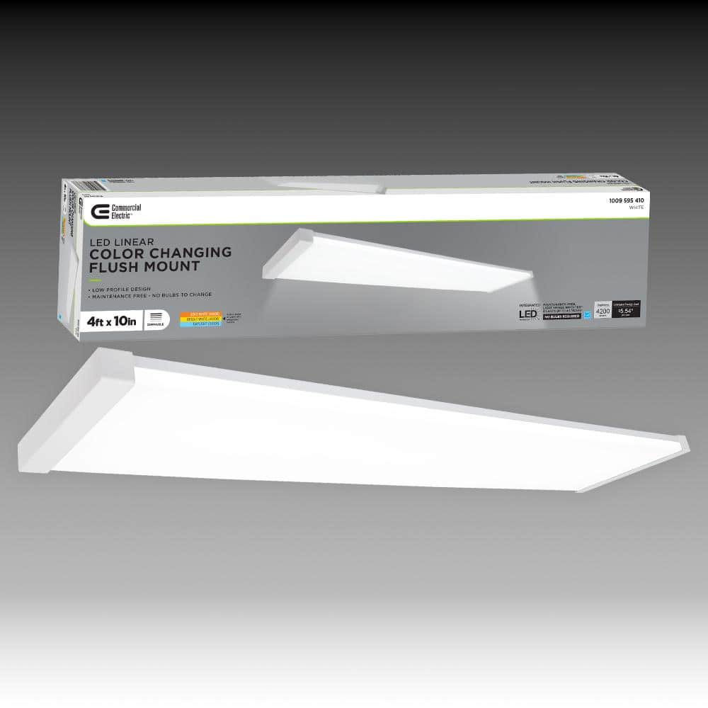 Commercial Electric 4ft. x 10in. LED Flush Mount Ceiling light with White Wood designed end caps adds a bit of Modern decorative flair to your home or office. Prior to installation, adjust color temperature between Soft White, Bright White or Daylight depending on your lighting needs and it is dimmable. This fixture is made of durable materials and frosted lens producing crystal-clear illumination with no yellowing or discoloration over time. Its lightweight construction makes for easy installation while the LED technology ensures eco-friendly, long-lasting service and maintenance free operation. Great for kitchen, family room, office/den, bedroom, bathroom, laundry room, hallway, or game room.