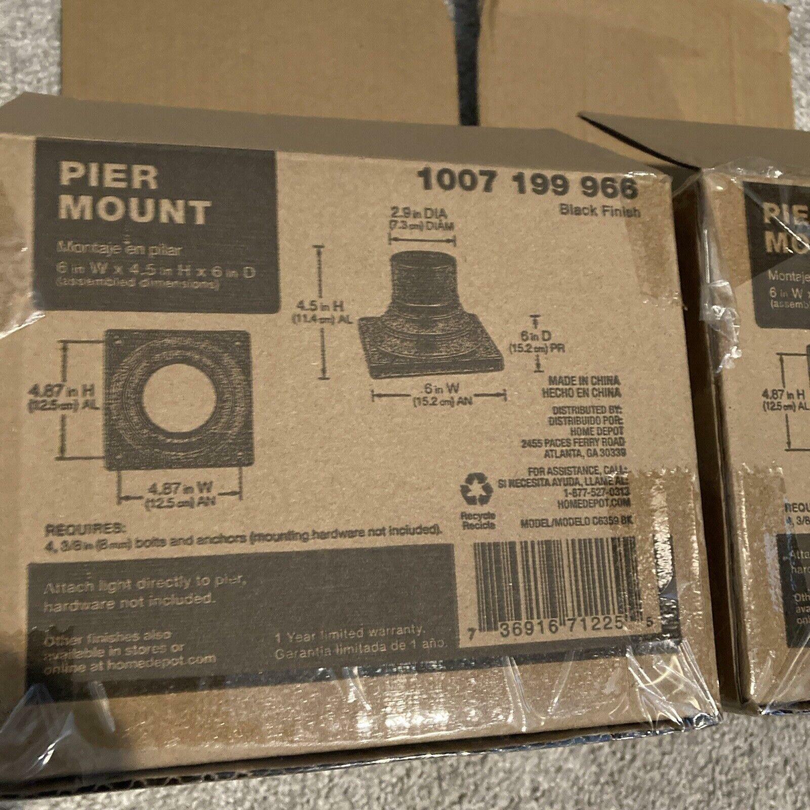 Pier Mount, 6 in. Square Black Pier Mount Base for Outdoor Post Light Fixture, some box damage.Attach light directly to pier, hardware not included.