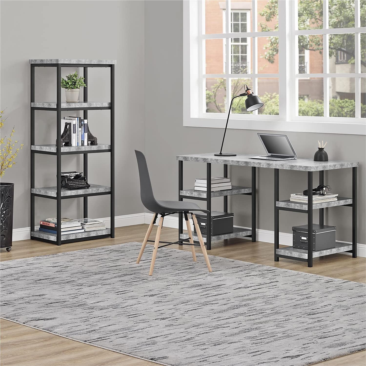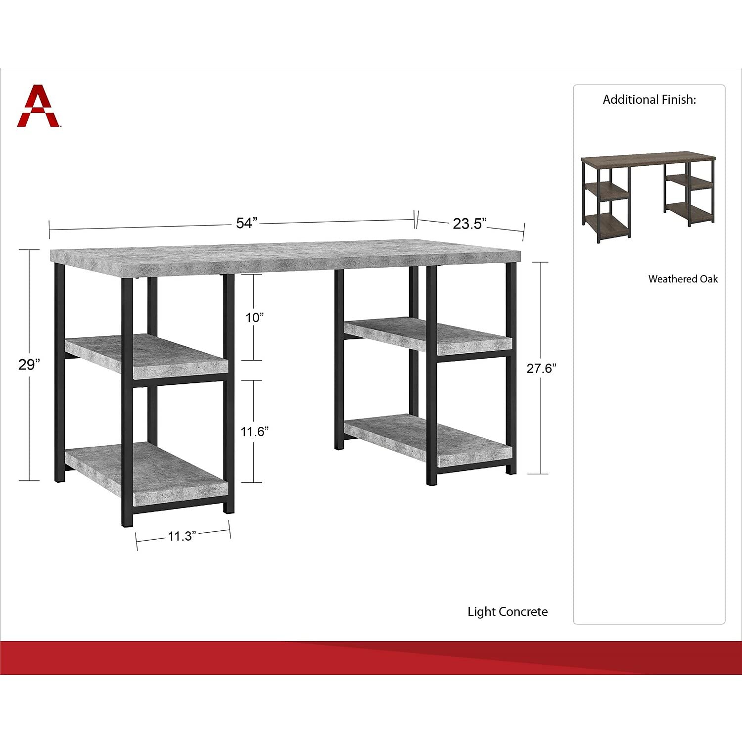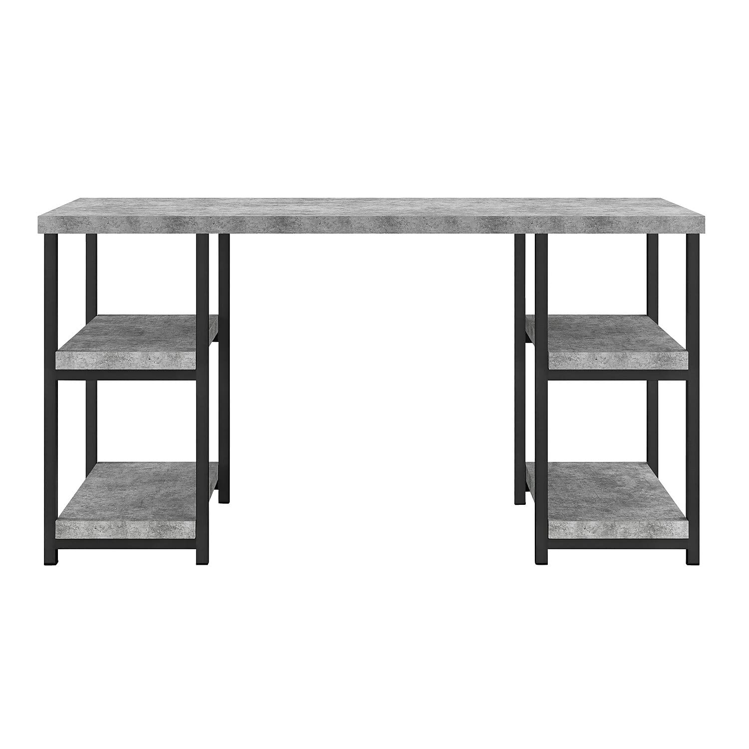 Your home office can now be functional and phenomenal thanks to this multi-functional desk from Ameriwood Homes Ashlar collection. Crafted in the double-pedestal style, this desk boasts a faux-concrete look made from specially laminated paper, making it easy to clean and simple to maneuver. The 4 open shelves are built to hold all your home-office needs, from a printer and scanner to paper, pens, agendas, and more. Just add accessories and make yourself at home! Sturdy black metal legs are made to support and distribute the load, so the Ashlar desk is all you need to get your work done. This trendy piece is designed to be budget-friendly and requires some light assembly.