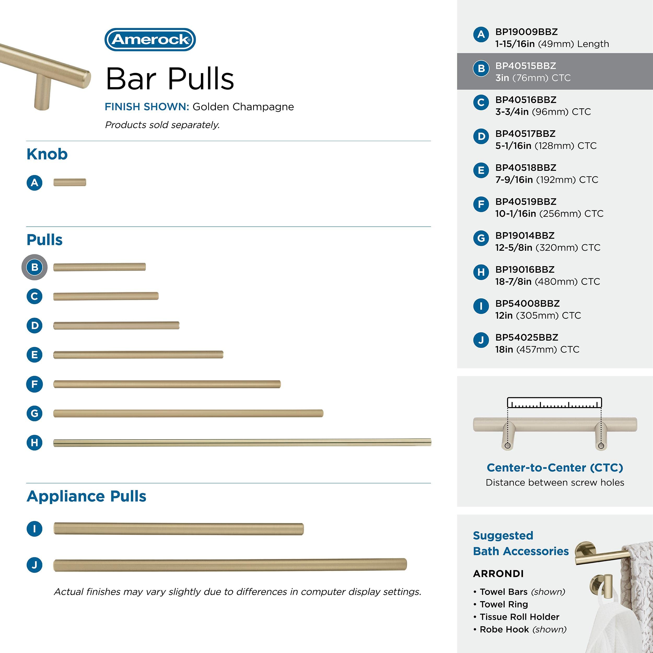 The Amerock BP40515BBZ Bar Pulls 3 in. (76 mm) Center-to-Center Pull is finished in Golden Champagne. Modern functionality meets straightforward styling. Simple. Bold. True. The sleek and sophisticated design of the Bar Pulls Collection makes a statement with clean lines and smooth textures. Golden Champagne: raise a toast to this rich metallic finish. Warm and inviting without being brassy and featuring hints of silver in reflective light, this attractive hue elevates designs with enviable versatility. Use for a soft and elegant touch on lighter finishes or as a contrasting pop against darker finishes. Founded in 1928, Amerocks award-winning home solutions including decorative and functional cabinet hardware, bath accessories, decorative hooks and wall plates have built the company's reputation for chic design accessories that inspire homeowners to express their personal style. Amerock offers a variety of styles and finishes at affordable prices that add the perfect finishing touch to any room.