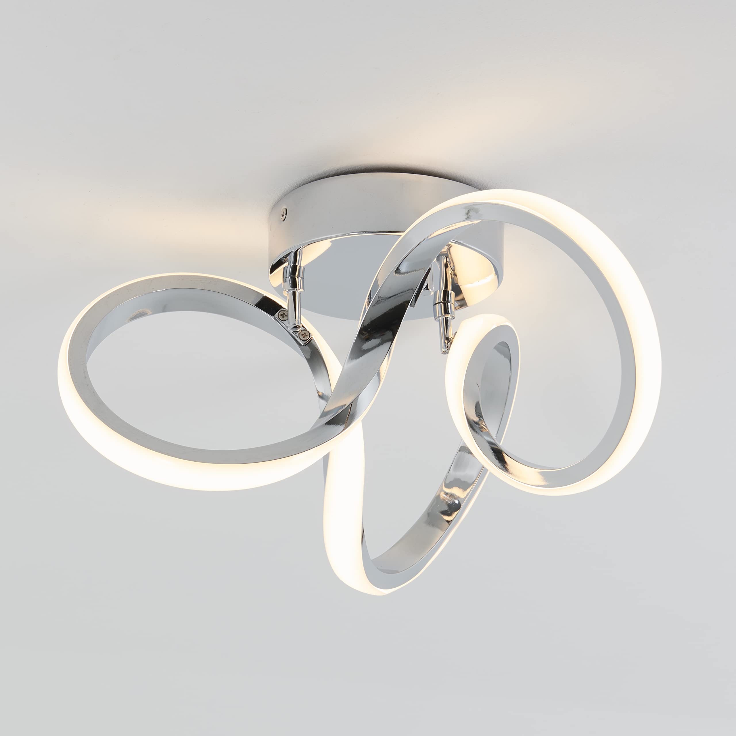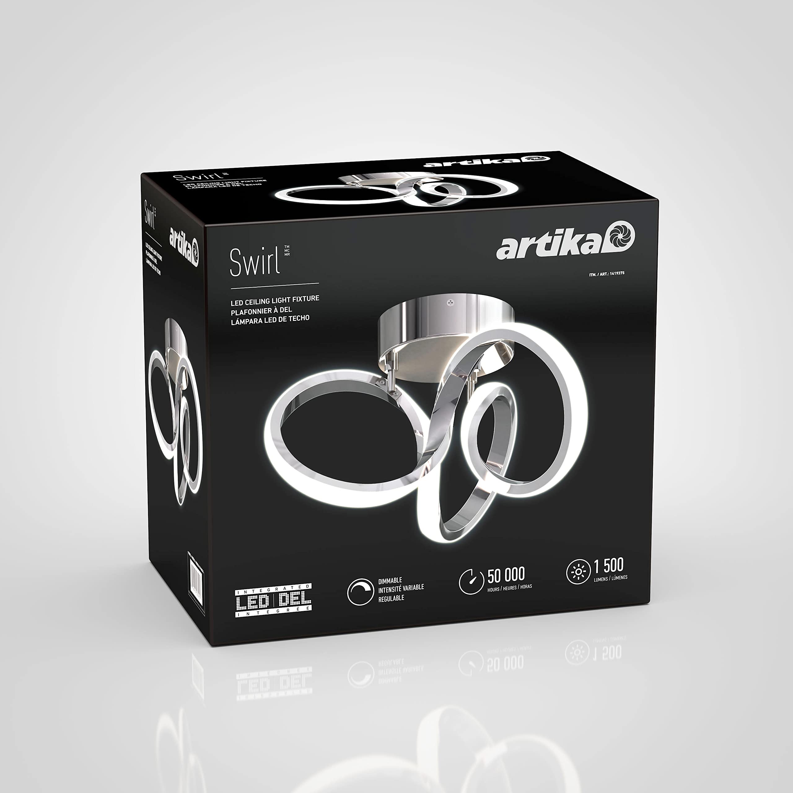 Its impossible not to notice the Swirl LED ceiling light, which also doubles as a work of art! Both its name and design muster images of eddies and currents. This bold light fixture catches the eye with its chrome finish and ingenious design with integrated LED lights. Add it to your living room, dining room or any other favourite room for a dramatic effect. This modern LED ceiling light will illuminate your decor with a brightness of 1100 lumens for up to 50,000 hours. Use a compatible LED dimmer to adjust the light intensity. No bulbs are required, and installation is easy. Features LED Dimmable Certification ETL Specs Lumens 1500 Lifetime (Hours) 50000 CCT K 2700 K Total Wattage 26 Voltage 120 Product Dimension 13.6 " L x 13.6 " W x 7.5 " H Product Weight (lbs) 1.9 Box Dimension 13.8 " L x 8.9 " W x 12.6 " H Box Weight (lbs) 3.4 Indoor / Outdoor Indoor Frame Material Aluminum Lens Material Rubber Color Rendering Index 80 Download product manual
