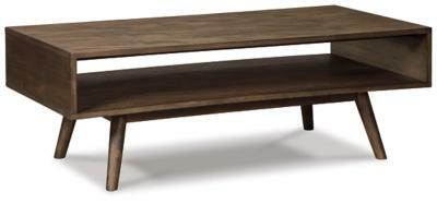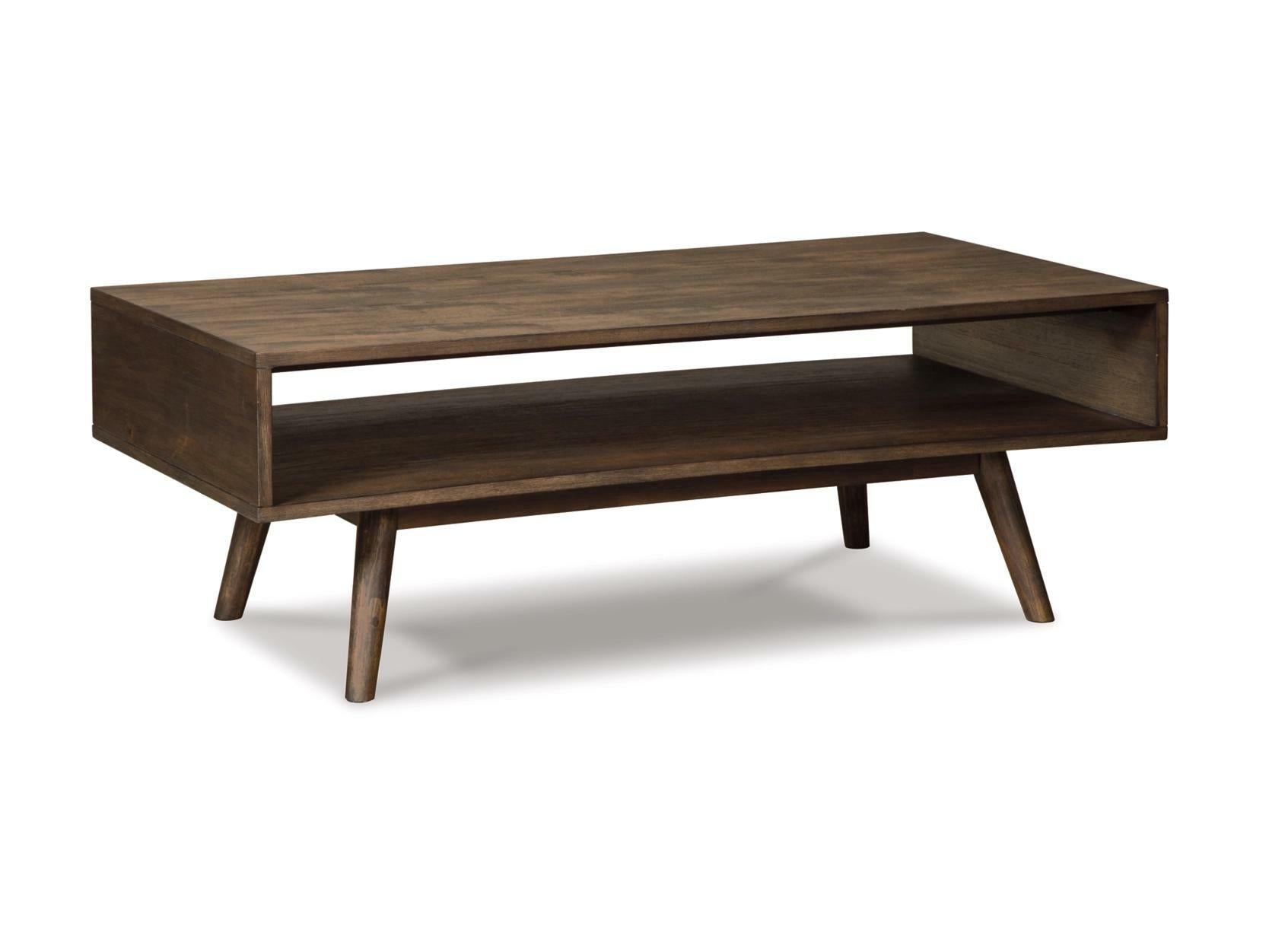 With its canted peg legs and low, linear profile, the Kisper coffee table is a mastery in mid-century minimalism. The look may be high-end gallery design, but the price is beautifully down to earth. Brushed dry brown finish is wonderfully easy on the eyes. Open shelving fuses form and function.