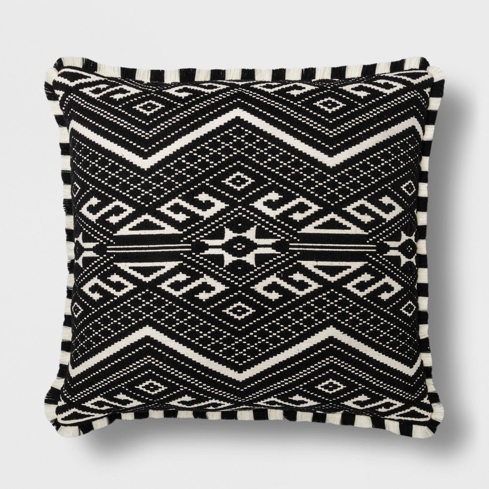 Give your living space a bold update with this Fringed Jacquard Euro Pillow from Opalhouse?? This eye-catching black and white Euro pillow adds texture and dimension to your living space with its intricate geometric imagery. You can use it as a decorative pillow in your bedroom collection, or place it on your sofa to bring sophisticated flair to your living room. Coordinating black and white fringes around the edge add refined detail, making this accent pillow a versatile option for complementing other p