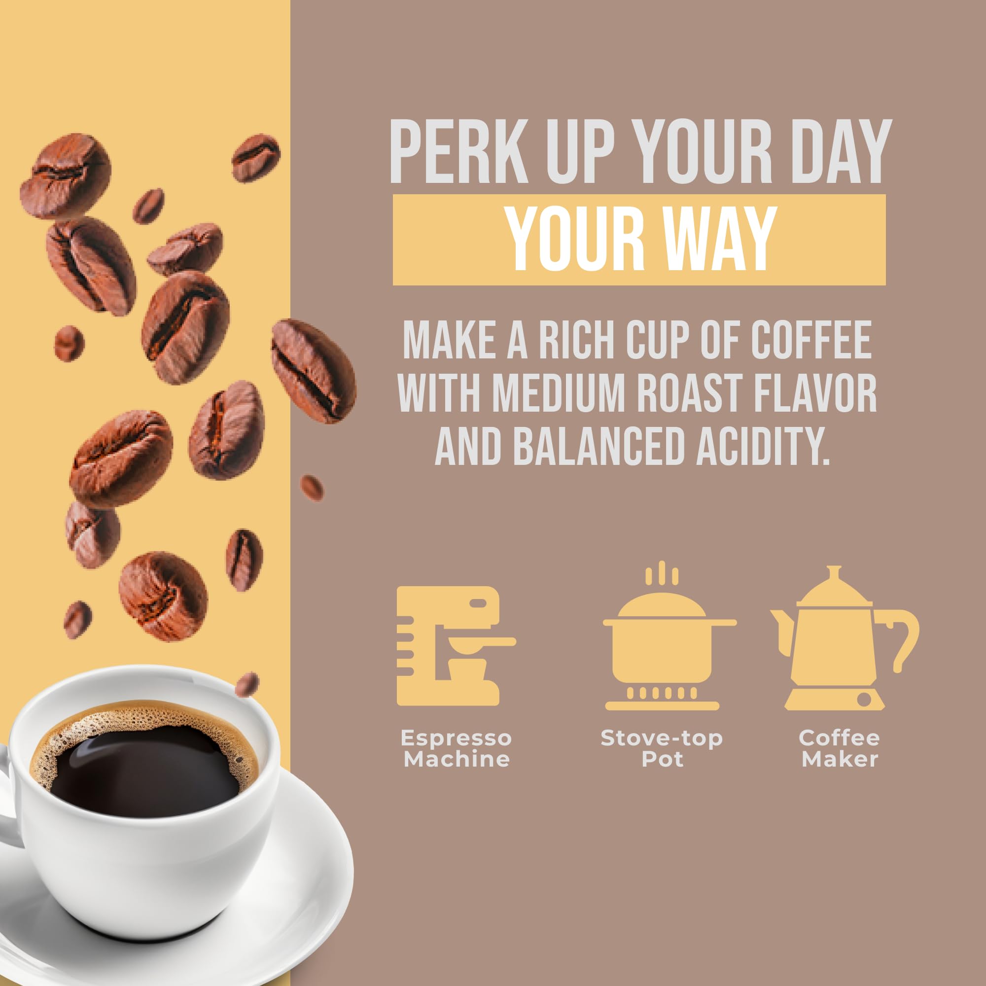 Indulge in the rich taste of our ground coffee, made from Arabica beans known for their rich flavor and aroma. Each sip of our medium-roasted Arabica beans offers refined flavor, presenting a well-balanced body with a smooth, citrus finish. Perfect for your morning brew or as the base for lattes and cappuccinos, this coffee, with its distinct citrus notes, is versatile for any time of day. Our ground coffee is available in packaging options that fit your lifestyle. Choose from a single 12 oz bag or the double pack featuring two 12 oz bags, ideal for those who want to stock up. Embrace the flexibility of brewing that suits your lifestyle. Whether you prefer the classic touch of a drip machine, the deep flavors from a French press, or crafting both hot and cold lattes, our ground coffee beans adapt to your preference, ensuring a perfect cup every time. Our family-owned and operated business has been a cornerstone in the coffee industry since 1961. Our commitment to quality is unwavering as we continue to bring you the best-tasting coffee roasts and blends.