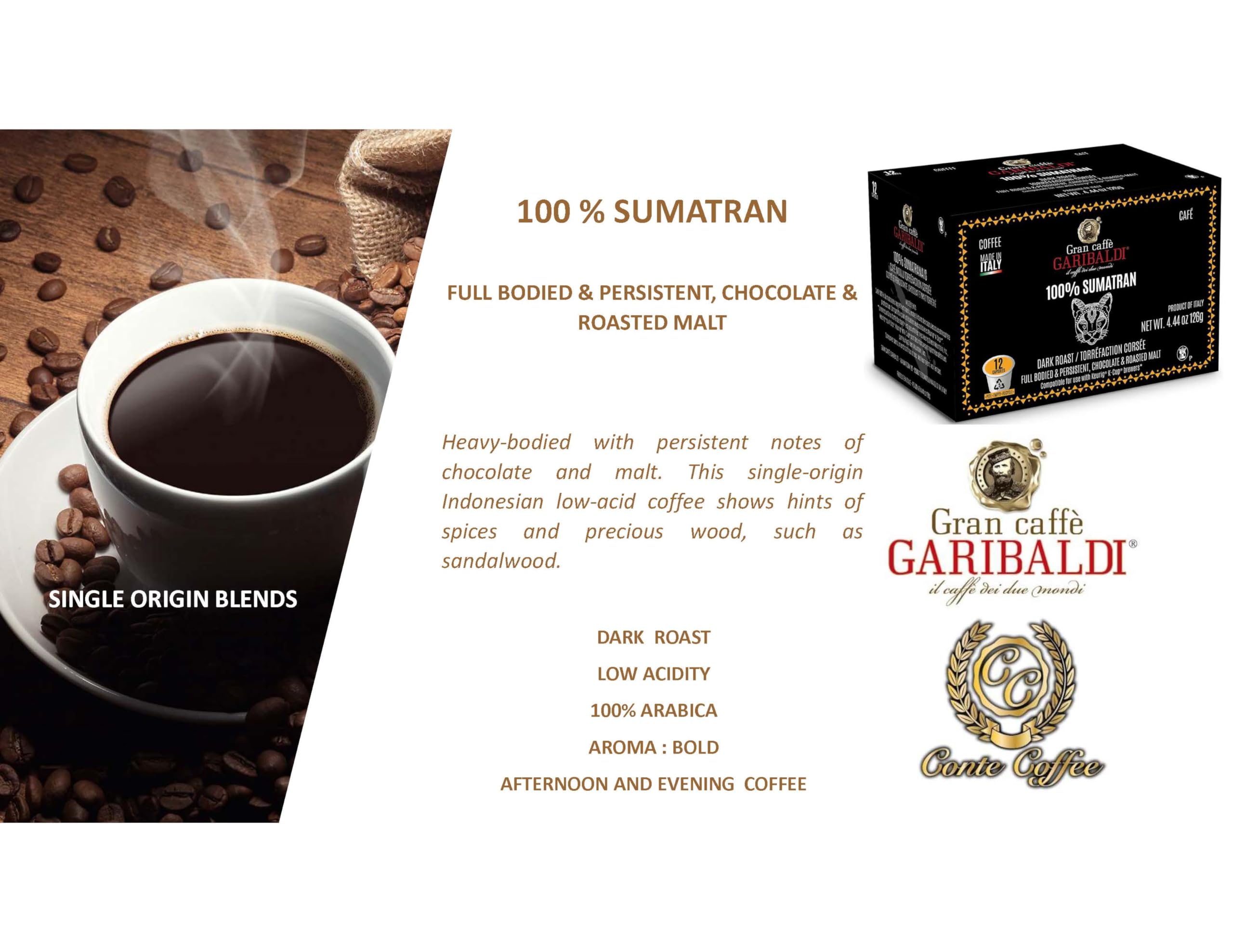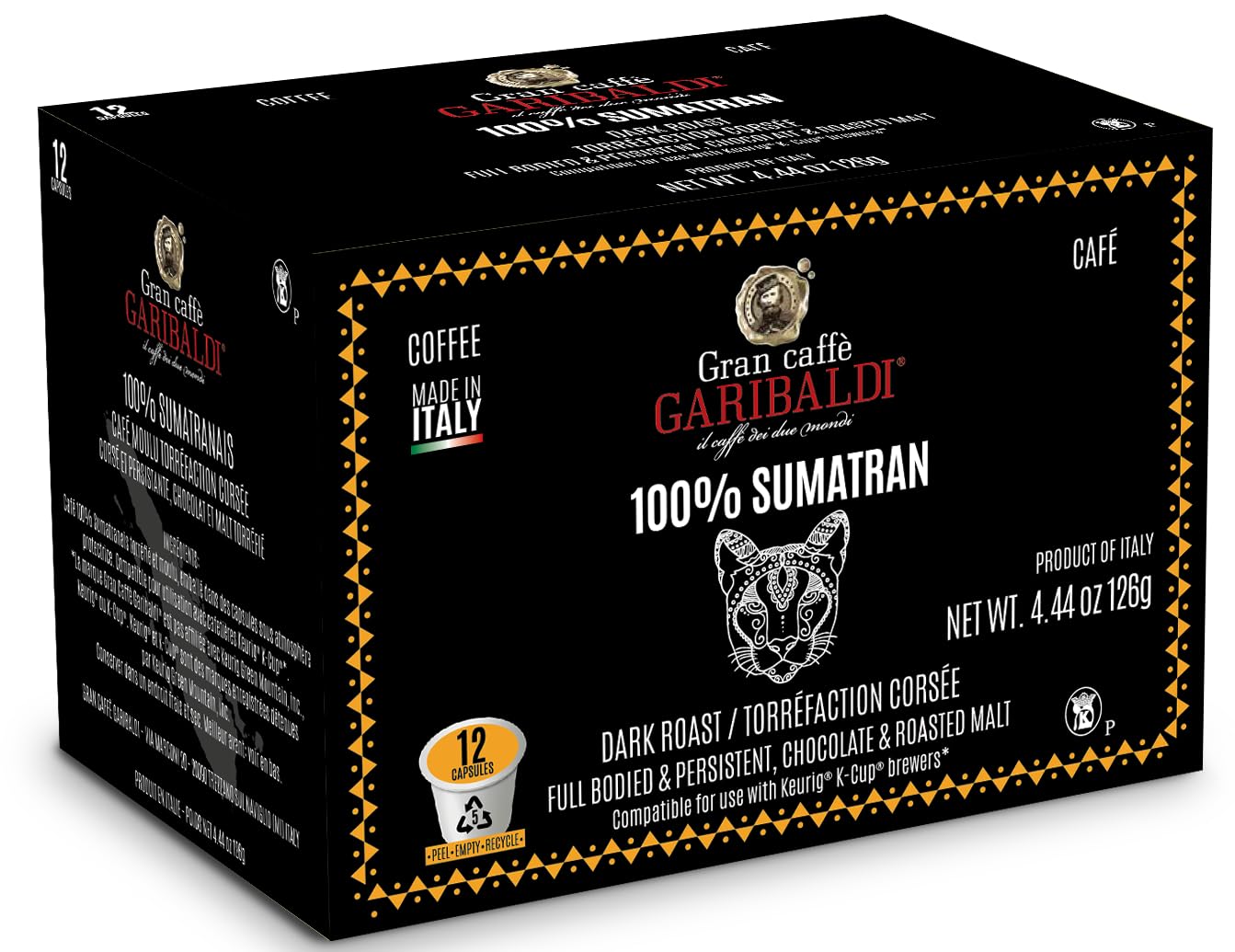 Get ready to experience the top of the line Single Serve Cups for Keurig K-Cup Brewers available on Amazon. Gran Caff Garibaldi, the four corners of the world in every single cup. The aroma of far off lands brought to life by true Italian roasting mastery. 12 Count (1-12 count boxes) single serve coffee k-cups for all Keurig Machines. 100% SUMATRAN - Full Bodied and lingering, chocolate and roasted malt - Heavy-bodied with lingering notes of chocolate and malt. This single-origin Indonesian low-acid coffee shows hints of spices and precious wood, such as sandalwood. DARK ROAST - LOW ACIDITY- AFTERNOON AND EVENING COFFEE. Check out our entire line of Gran Caff Garibaldi that includes k-cups, Nespresso compatible capsules and whole bean espresso. Enjoy your taste of Italy!
