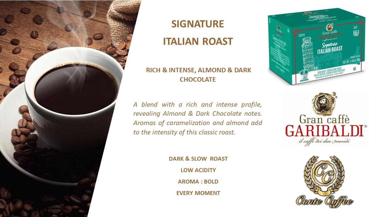 Get ready to experience the top of the line Single Serve Cups for Keurig K-Cup Brewers available on Amazon. Gran Caff Garibaldi, the four corners of the world in every single cup. The aroma of far off lands brought to life by true Italian roasting mastery. 12 Count (1-12 count boxes) single serve coffee k-cups for all Keurig Machines. SIGNATURE ITALIAN ROAST - RICH & INTENSE, ALMOND & DARK CHOCOLATE A blend of the finest coffees from around the world, masterfully roasted to bring Italian artistry & Conte Coffee's influence to this classic blend. DARK ROAST, LOW ACIDITY, AROMA : BOLD EVERY MOMENT Check out our entire line of Gran Caff Garibaldi that includes k-cups, Nespresso compatible capsules and whole bean espresso. Enjoy your taste of Italy!