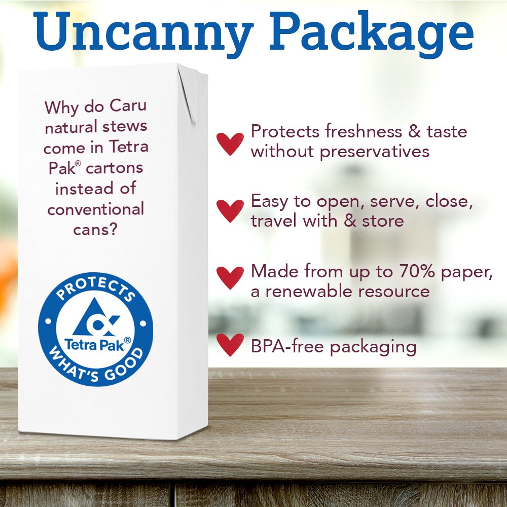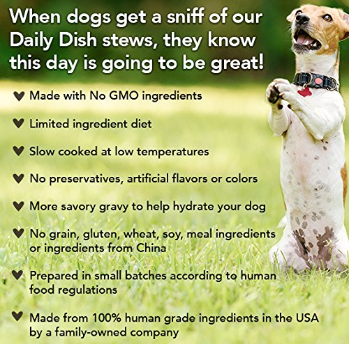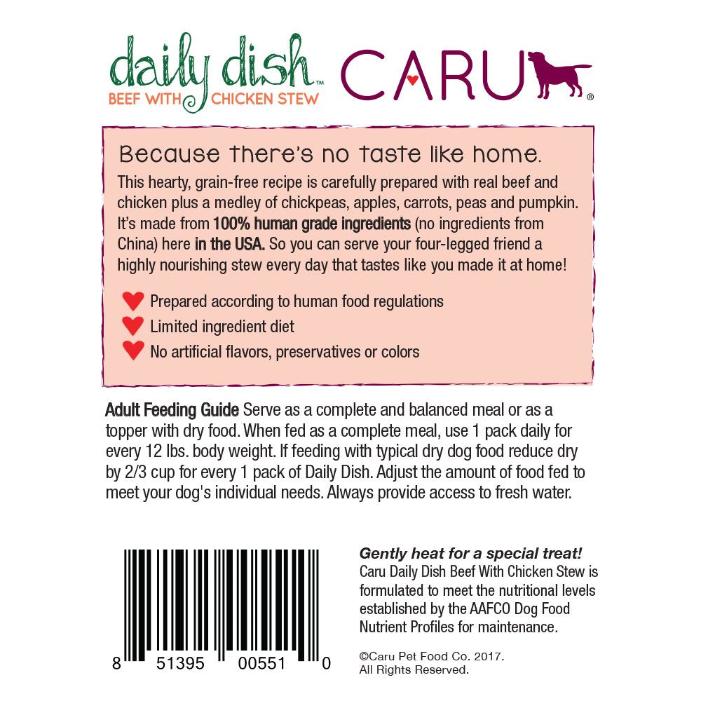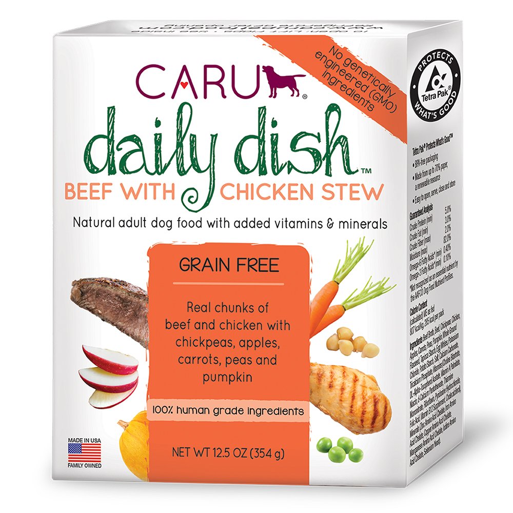 Give your dog something to look forward to every day with the Caru Daily dish beef with chicken Stew grain-free wet dog food. Proving that natural and nutritious dog food can also be priced just right, This recipe is made with superior 100% human grade ingredients in a human food plant right here in the usabecause your dog deserves food that is just as good as yours. Its slow cooked right in the pack with an exclusive low temperature, small batch process to preserve the nutritional value of the ingredients, which includes real beef, chicken, chickpeas, apples, carrots, peas and pumpkin. It all adds up to the taste and aroma of a home-cooked meal!