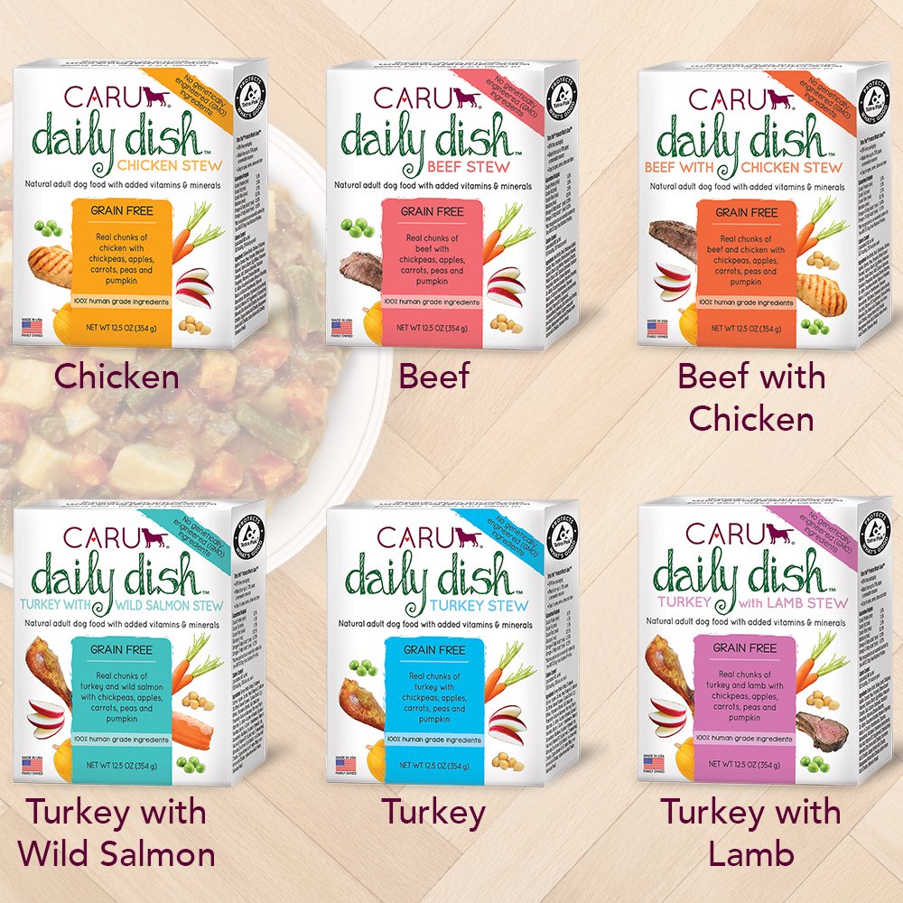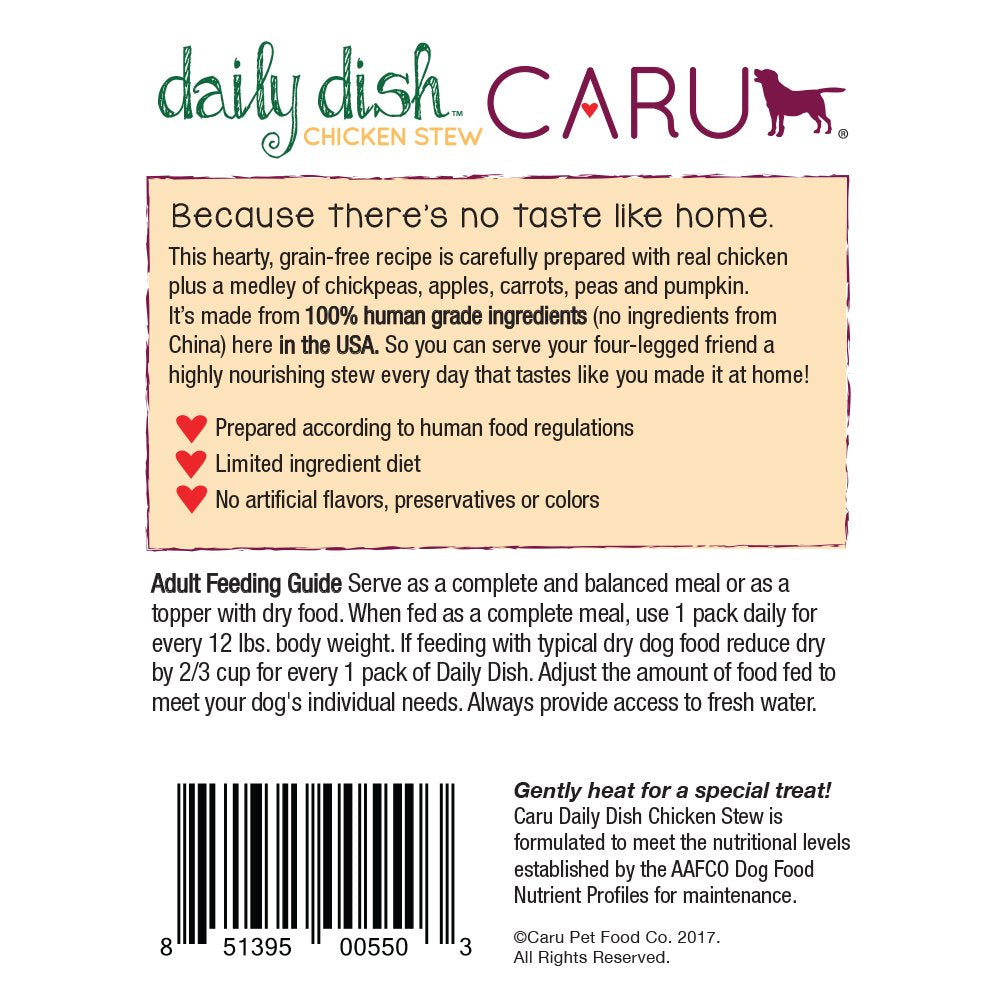 Give your dog something to look forward to every day with the Caru Daily Dish Chicken Stew Grain-Free Wet Dog Food. Proving that natural and nutritious dog food can also be priced just right, this recipe is made with superior 100% human grade ingredients in a human food plant right here in the USAbecause your dog deserves food that is just as good as yours. Its slow cooked right in the pack with an exclusive low temperature, small batch process to preserve the nutritional value of the ingredients, which includes real chicken, chickpeas, apples, carrots, peas and pumpkin. It all adds up to the taste and aroma of a home-cooked meal!