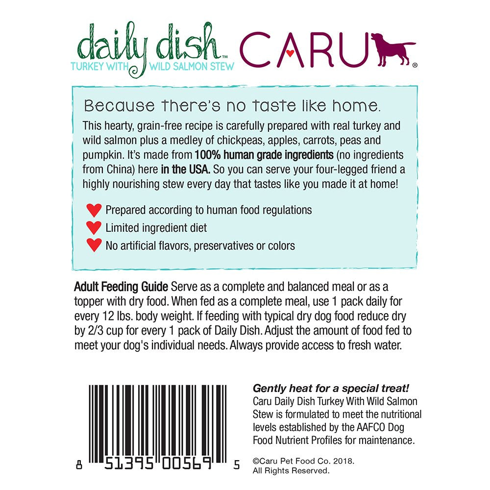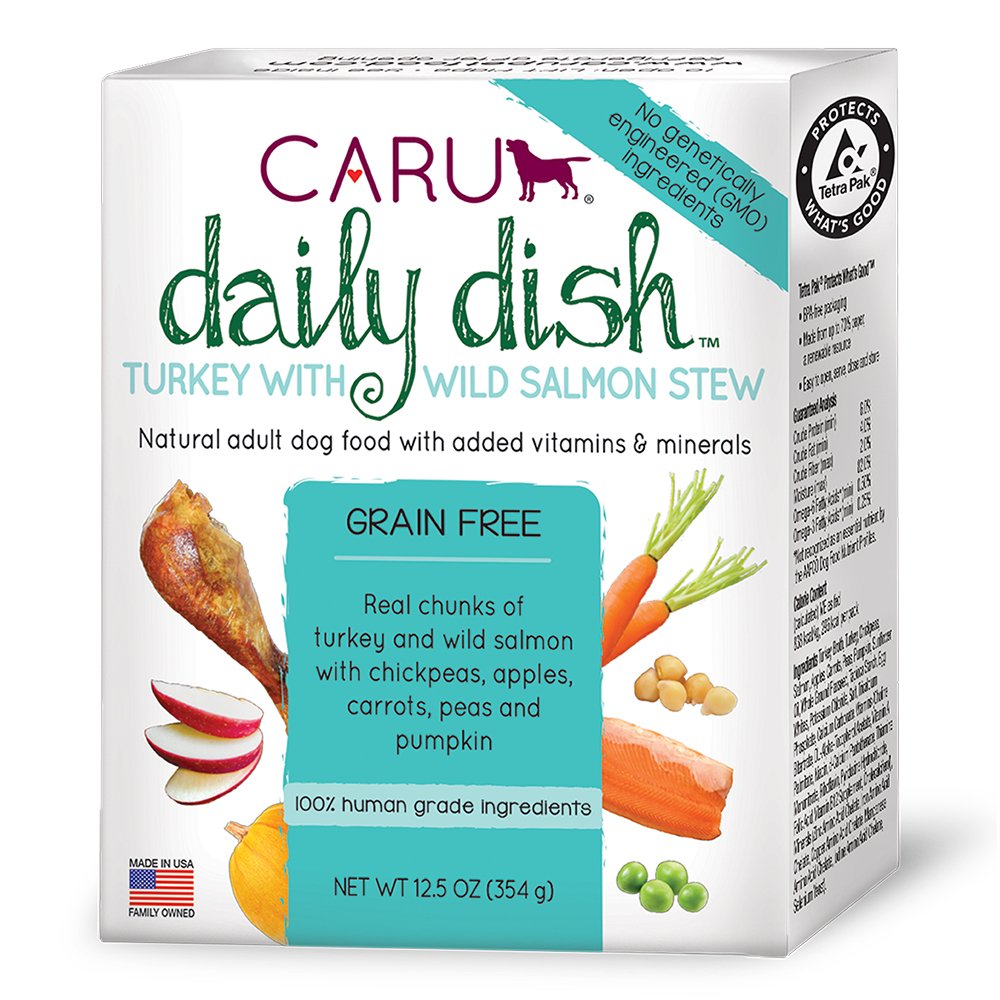 Give your dog something to look forward to every day with the Caru Daily Dish Turkey with Wild Salmon Stew Grain-Free Wet Dog Food. Proving that natural and nutritious dog food can also be priced just right, this recipe is made with superior 100% human grade ingredients in a human food plant right here in the USAbecause your dog deserves food that is just as good as yours. Its slow cooked right in the pack with an exclusive low temperature, small batch process to preserve the nutritional value of the ingredients, which includes real turkey, wild salmon, chickpeas, apples, carrots, peas and pumpkin. It all adds up to the taste and aroma of a home-cooked meal!