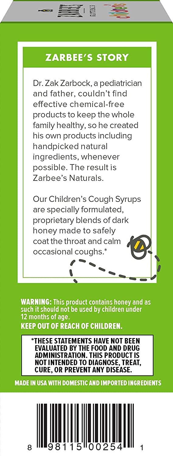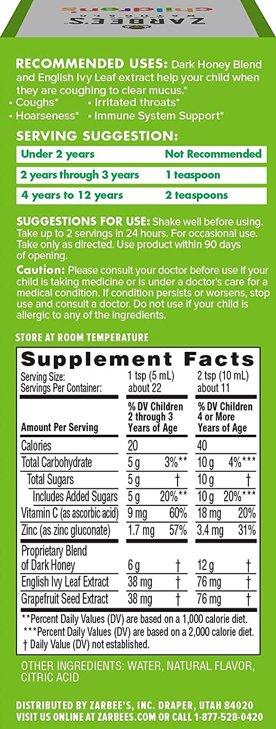 Zarbees Natural Children's Cough Syrup + Mucus Relief is made with our soothing honey blend and natural ivy leaf extract. Ivy leaf extract naturally things and loosens mucus wet cough. The unique blend will provide comfort when your little one needs it the most* .Our drug-free formula means your family can make it through your day without the unwanted side effects and grogginess of alcohol, dyes or gluten.Pediatrician developed and recommendedSafe and effective for children 12 months+Pediatrician recommendedSoothes coughs while thinning and loosening mucus*Immune boosting formula*Drug, Dye and Gluten-Free4 fl. oz. bottle* These statements have not been evaluated by the Food and Drug Administration. This product is not intended to diagnose, treat, cure of prevent any disease.