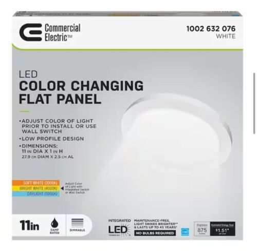 Commercial Electric Low Profile 11in. LED Flush Mount ceiling light is the perfect way to update your lighting by replacing outdated incandescent bulbs with an energy-efficient integrated LED fixture. Prior to installation, keep the existing White trim or choose the Oil Rubbed Bronze trim to add a little pop of color into your space. Additionally, select between 3 color temperatures of light output: Soft White, Bright White or Daylight using the slide switch on the back of the fixture. Activate the Night Light feature which emits a Soft Amber glow around the fixture providing warm ambient accent lighting. Our innovative mounting system allows for quick installation into existing junction boxes using the TwistFit mounting bracket. (included) This flush mount is maintenance free with no bulbs required and lasts up to 50,000 hours. Great for kitchen, pantry, bedrooms, bathrooms, closets, stairways, hallways, basement, laundry room, craft room, playroom, den/office, retail store or boutique.