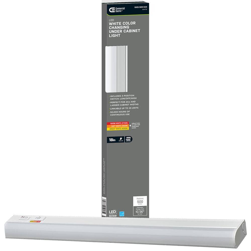 Commercial Electric 18in. Plug-in Color Changing 3-Position Switch LED Under Cabinet Light is designed to replace over-heated under cabinet incandescent puck and xenon lights with a crystal-clear energy-efficient LED fixture. What is unique about this fixture is that you customize the lights depending on your needs. Choose color of light output between Warm White Soft White or Bright White and use the 3-position step-dimmer for Low or High illumination; change back and forth at any time. This fixture is perfect for 24in. or larger cabinet widths and linkable up to 25 units; cables cords and hardware included. With a lifespan of up to 50 000 hours our LED under cabinet light is maintenance free with absolutely no bulbs to replace. Perfect for kitchen preparation underneath cabinets under desk-hutch workstations cabinet unit shelving workbench closet or accent lighting. COLOR TEMPERATURE OPTIONS: 2700K Warm White 3000K Soft White or 4000K Bright White Step Dimmable - Use 3-position switch for LOW o