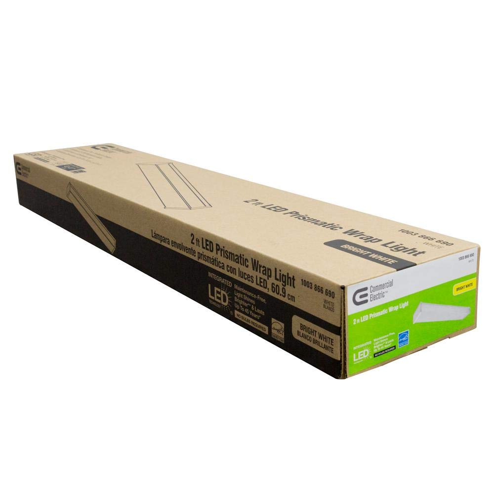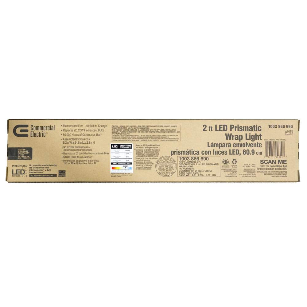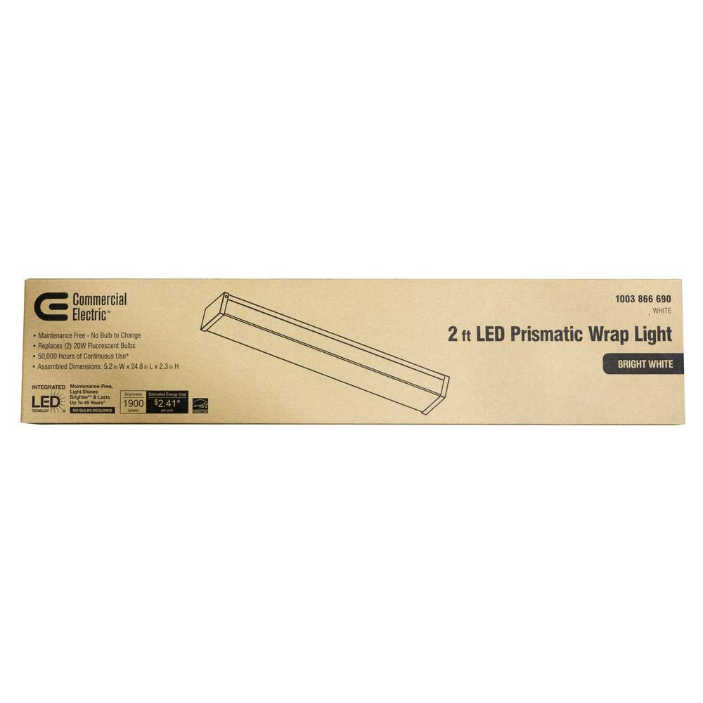 The 2 ft. integrated LED prismatic lens wrap from Commercial Electric is perfect for any application where a high quality, long-lasting light is needed. It can be easily installed and is perfect for replacing a traditional fluorescent fixtures. Its high-performance energy efficient LEDs will reduce your operating costs and save you money. Highlights Integrated (no bulb) led maintenance free Prismatic lens Quick connects 1900 Lumens of 4000k bright white light 50,000-hours ETL listed ENERGY STAR