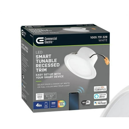 Commercial Electric s 4 in. Smart Integrated LED Recessed Light Trim with Hubspace is an innovative and entertaining way to illuminate your space. Create subdued romantic lighting or express your dramatic flair. Perfect for holidays celebrations or whatever your current mood; turn lights down low to a cool blue hue or having a party; turn lights to a popping red orange or yellow. Set up is quite simple; setup and manage your device with the Hubspace App. No Hub required. It is compatible with Google Home and Amazon Alexa. Now you are ready to create your own unique colorful lighting ambiance. Choose shade of white (2200K-6500K) or select from a full color spectrum. You can even group multiple lights together to control them from up to 30 ft. in your home. For even more convenience you can set up as voice activated. This fixture emits up to 655 Lumens of brightness using only 9.5-Watts of electricity. Ideal for home office entertainment areas restaurant retail boutique and much more. Manage your light