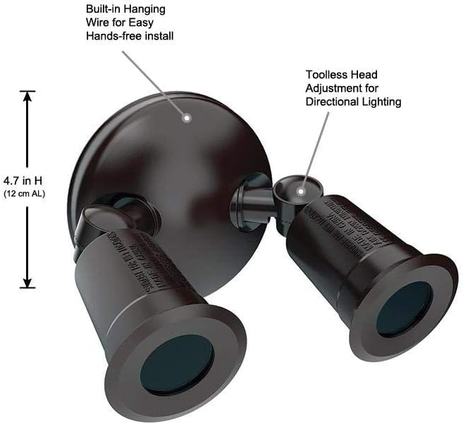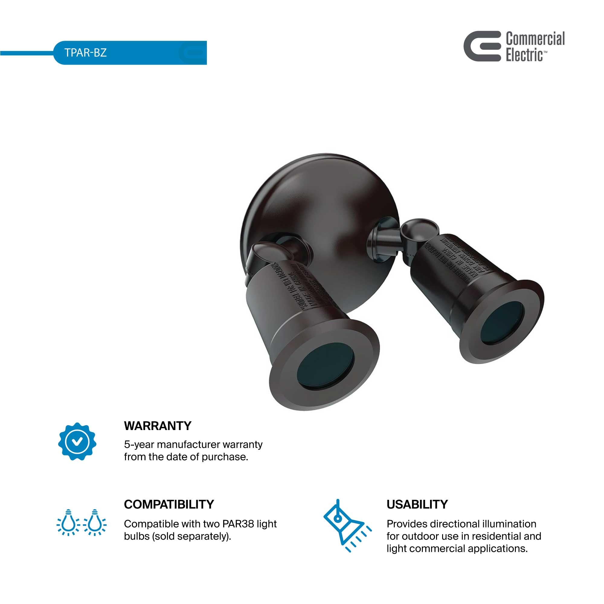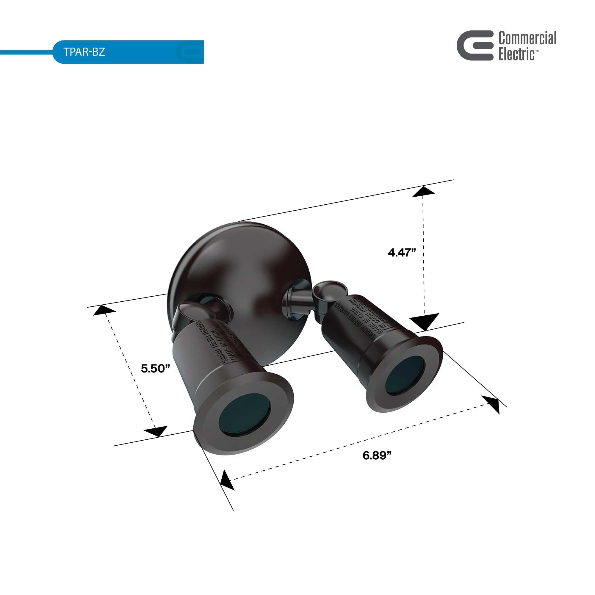 The wall or eave mount Twin-Head Bronze Outdoor Flood Light with Dusk-to-Dawn provides directional illumination for outdoor use in residential and light commercial applications. It features two adjustable PAR lamp heads to direct light where desired. This flood light is ideal for driveways, walkways, patios and general areas creating an inviting exterior space while providing safety and security.