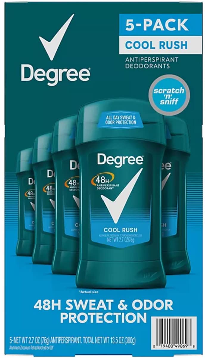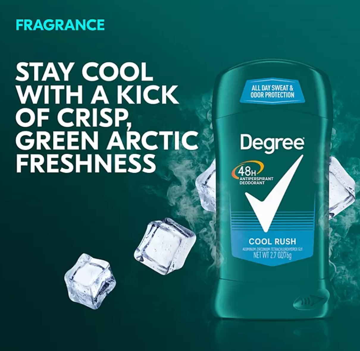 Degree Cool Rush Men Dry Protection Anti-Perspirant keeps you dry all day long. Degree antiperspirant has been formulated to combat increased levels of moisture when you work your hardest. This deodorant kicks in extra protection as you sweat more, keeping you dry and smelling fresh no matter how hard you're going. Which Deodorants Work Best For Athletes? Deodorants that don't stop working when athletes do are best. Whether you're exercising, playing a game or just out in the summer heat, you need a deodorant that works as hard as you do. Degree Sport deodorant has a special body heat-activated formula that saves its best for when you need it most. Where Do You Need Protection Against Moisture? Most people put on deodorant right after they shower, but what if you forgot or want to keep an extra stick of deodorant somewhere else, just in case? This five-pack of Degree men's deodorant gives you the flexibility to stay fresh wherever you are. You'll have a spare ready to go so you'll never have to deal with that sinking feeling of stepping out of the shower and realizing you're out of deodorant. What Does Degree Sport Deodorant Smell Like? Degree men's stick deodorant has been infused with a special scent called Cool Rush. Cool Rush is a subtle, masculine scent that is equal parts clean and refreshing. Rather than overpower you with intense smells and ingredients, Degree men's deodorant is for those who just want a little extra fragrance to help them smell their best.