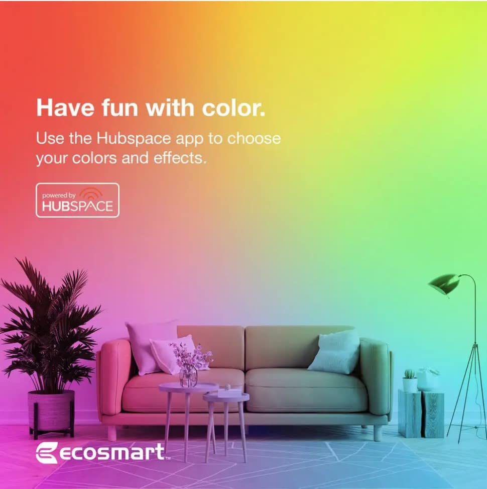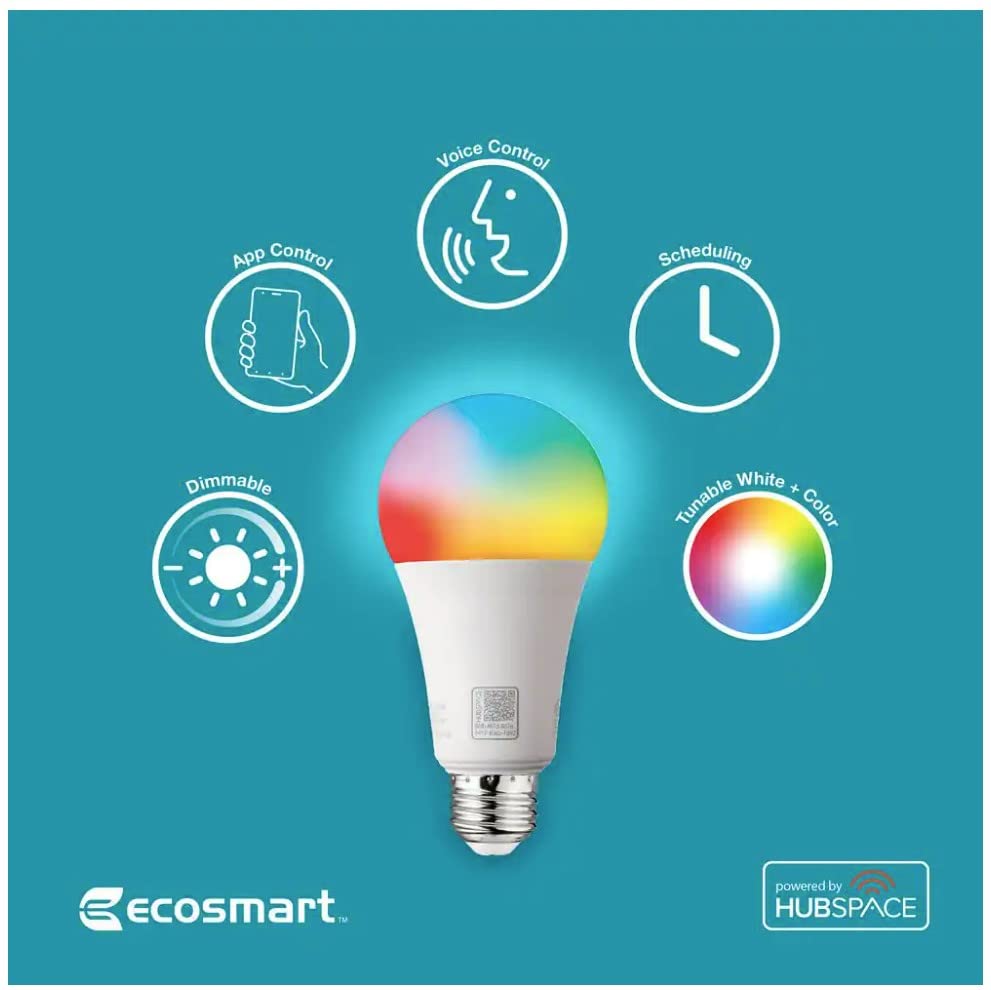 Eco-Smart 60w A19 High Lumen Smart Bulb w/ Voice Control, 1600 Lumens, Full Spectrum, Color Changing CEC LED Light, WiFi Bluetooth Hubspace, Compatible with Alexa Hey Google Assistant T20