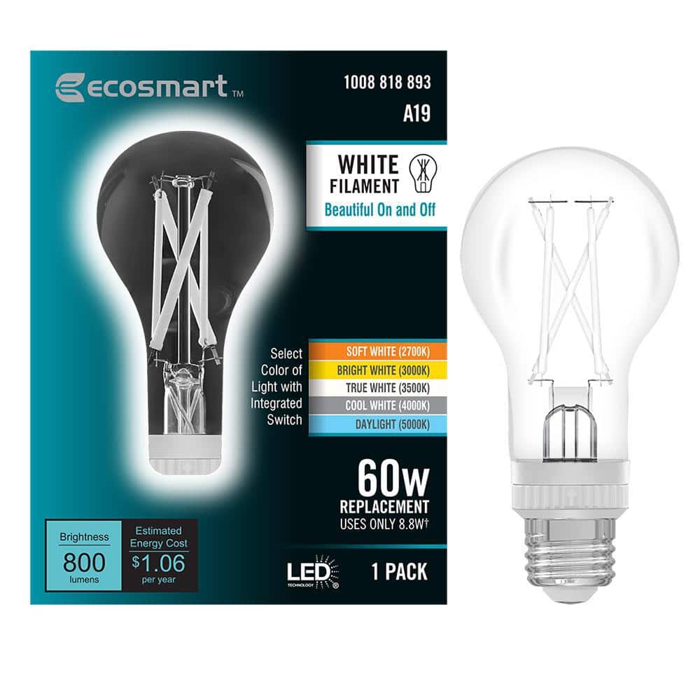 Upgrade your lighting to EcoSmart s elegant Exposed White Filament LED Bulbs for a fresh take on vintage bulbs. These first-of-their-kind white filament bulbs take a traditional clear glass A-shape bulb and add lower-profile white filaments. Unlike yellow filaments these blend into any decor style for a timeless look that complements any room. They provide dimmable 2700K 3000K 3500K 4000K or 5000K White light ideal light for craft rooms bathrooms kitchens laundry rooms utility rooms and anywhere you desire invigorating light. Their bluish-white light is perfect for reading working on intricate projects and seeing fine details. Use these bulbs in any fixture with a medium E26 base for a variety of general-purpose and decorative lighting applications. A19605CCTCA/WFIL/ECP bulbs emit 800 lumens of light while using just 8.8 watts up to 85.3% less energy than standard 100-watt incandescent bulbs. A 90+ CRI infuses vibrance into your space bringing out truer colors and more natural skin tones. Get up