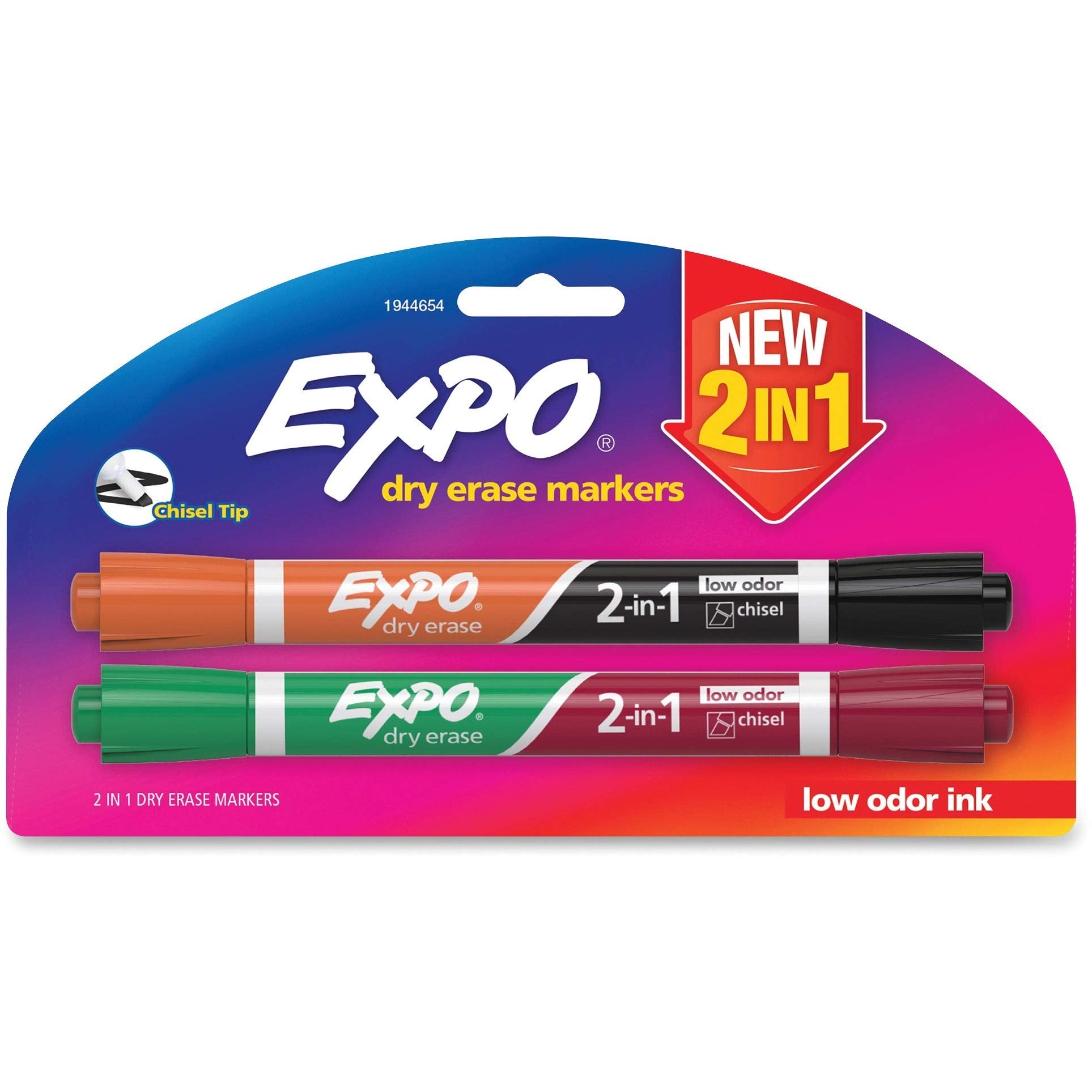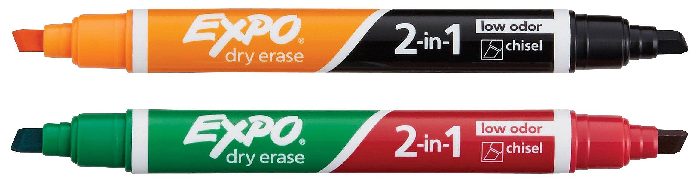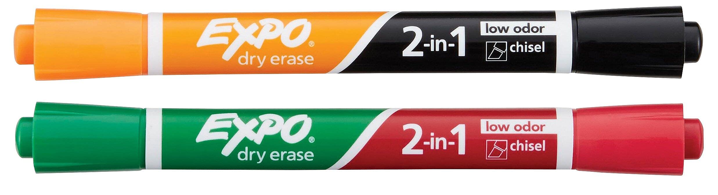 Dry-erase markers feature a two-in-one design to let you quickly switch colors without changing markers. Low-odor, nontoxic ink wipes away easily with a dry cloth or eraser. Versatile chisel tip creates thick or thin lines to ensure your writing stands out. Dry-erase markers are designed for use on whiteboards, glass and most nonporous surfaces.
