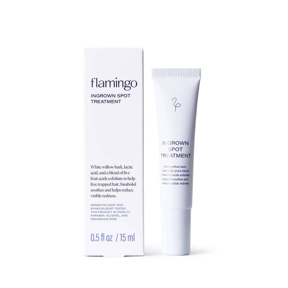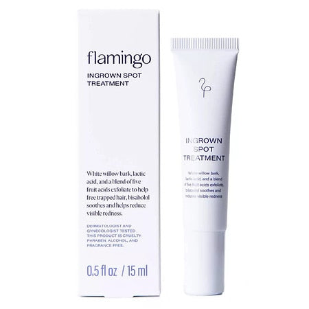 The Flamingo Ingrown Hair Spot Treatment is an exfoliating ingrown hair solution you can depend on to help resolve ingrown hairs and reduce visible redness. The gel cream is the perfect dose of alcohol-free exfoliation. White willow bark lactic acid and a blend of five fruit acids gently exfoliate the skin to help free trapped body hair. Bisabolol soothes while reducing visible redness so you can see and feel the results. An ingrown hair forms when the opening of a hair follicle is covered with dead skin cells so instead of growing as expected the hair curls back on itself forming an ingrown hair bump. Ingrown hairs are a totally normal but an uncomfortable part of having and growing body hair.