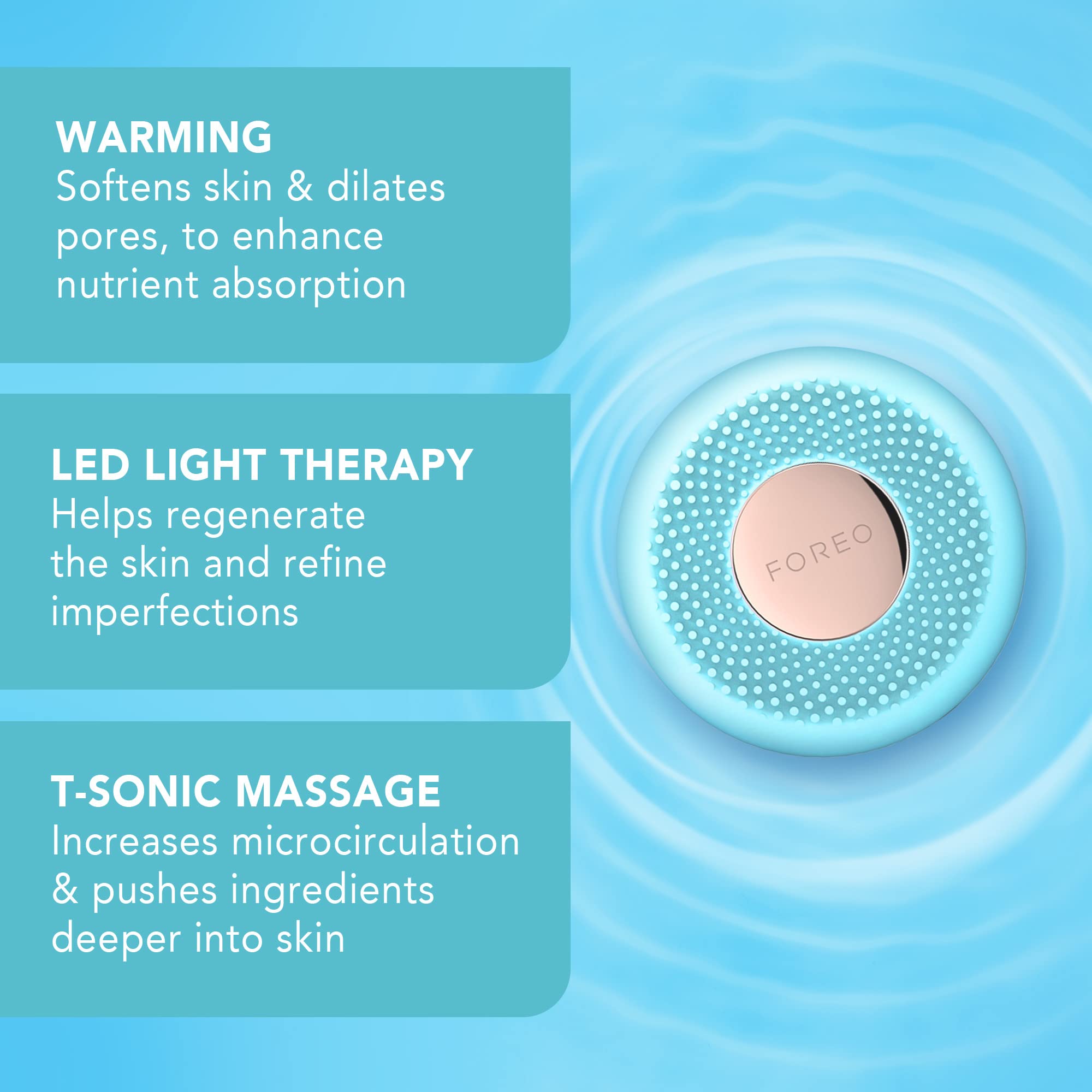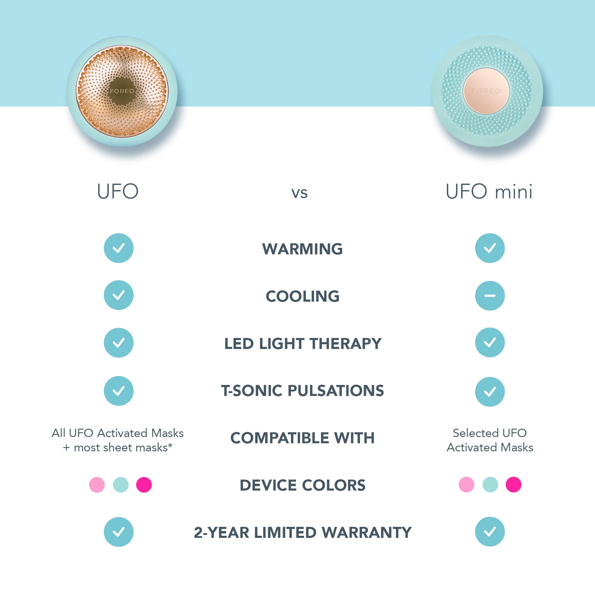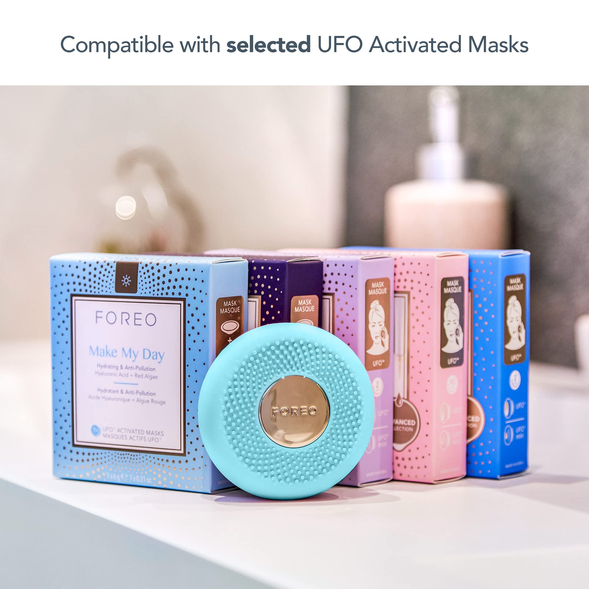Product Description UNMASK RADIANT SKIN Slim, simple, and designed to help you mask smarter, UFO mini offers a full facial treatment whether youre at home or on-the-go. This vibrant device features LED light therapy and indulgent Thermo-Therapy. Together with T-Sonic pulsations, UFO minis innovative technology infuses mask essence deep into your skin, for a selfie-worthy complexion in 90 second. HYPER-INFUSION Heating (Thermo-Therapy) opens the pores, helping the skincare product absorption and enhancing penetration of skincare ingredients. It also aids skin health, increasing blood circulation and ushering along proteins and nutrients to take away waste. T-Sonic Pulsations help light reach deeper into pores for increased effectiveness, providing soothing facial massage and facilitating better absorption of skincare products. RGB LED LIGHT THERAPY Using pre-set programs UFO minis RGB LED light therapy enables you to get a relaxing, effective, professional-level spa treatment at the comfort of your home. Red Light increases production of collagen and fibroblasts as well as circulation and formation of new capillaries. Green Light improves pigmentation issues from causes such as sun damage, revealing a brighter, more even complexion. Blue Light stimulates blood flow, astringing and tightening loose skin. A WHOLE NEW WAY TO MASK UFO mini effortlessly glides across every inch of your face, activating essential ingredients in our exclusive Korean mask formulas. The UFO-activated smart masks are made from soft micro-fiber, infused with plant and fruit extracts, concentrated botanical oils and natural flower water. Each mask is paired with a pre-programmed app-controlled treatment routine to boost their effects and ensure flawless skin. Brand Story FOREO is a Swedish multi-national beauty brand established and headquartered Stockholm, Sweden. Founded in 2013, the company produces facial cleansing brushes