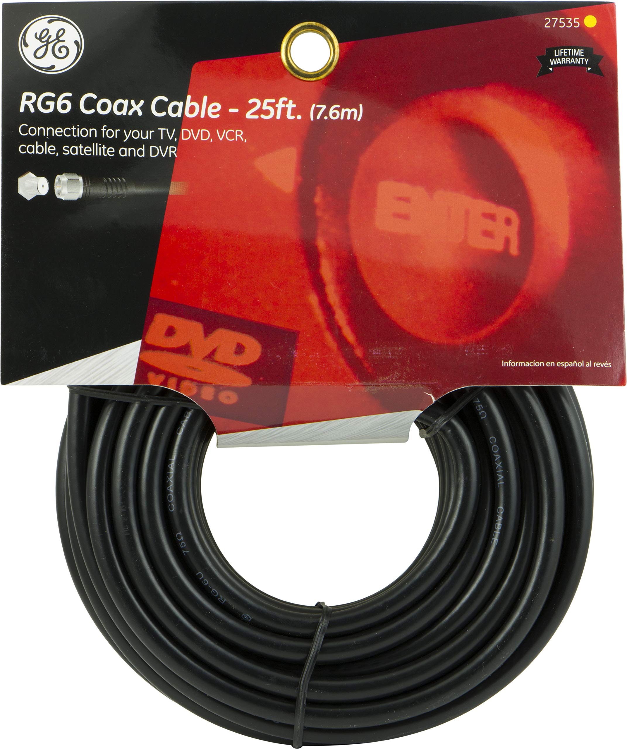 Gain superior signal quality with the ge-branded RG6 25ft. Coax cable. This high-performance coax cable joins together any two video components Equipped with F-type jacks use the cable to connect your TVs, cable boxes, antennas, DVRs and more. To ensure crisp signal quality, The cable Features a corrosion resistant compression connector and solid core conductor. The extra-long 25ft. Cable provides versatile setup options for your indoor space simply attach the connectors onto the F-type jacks located on the back of each component you wish to use. Upgrade your home entertainment system with the ge-branded RG6 25ft. Coax cable.