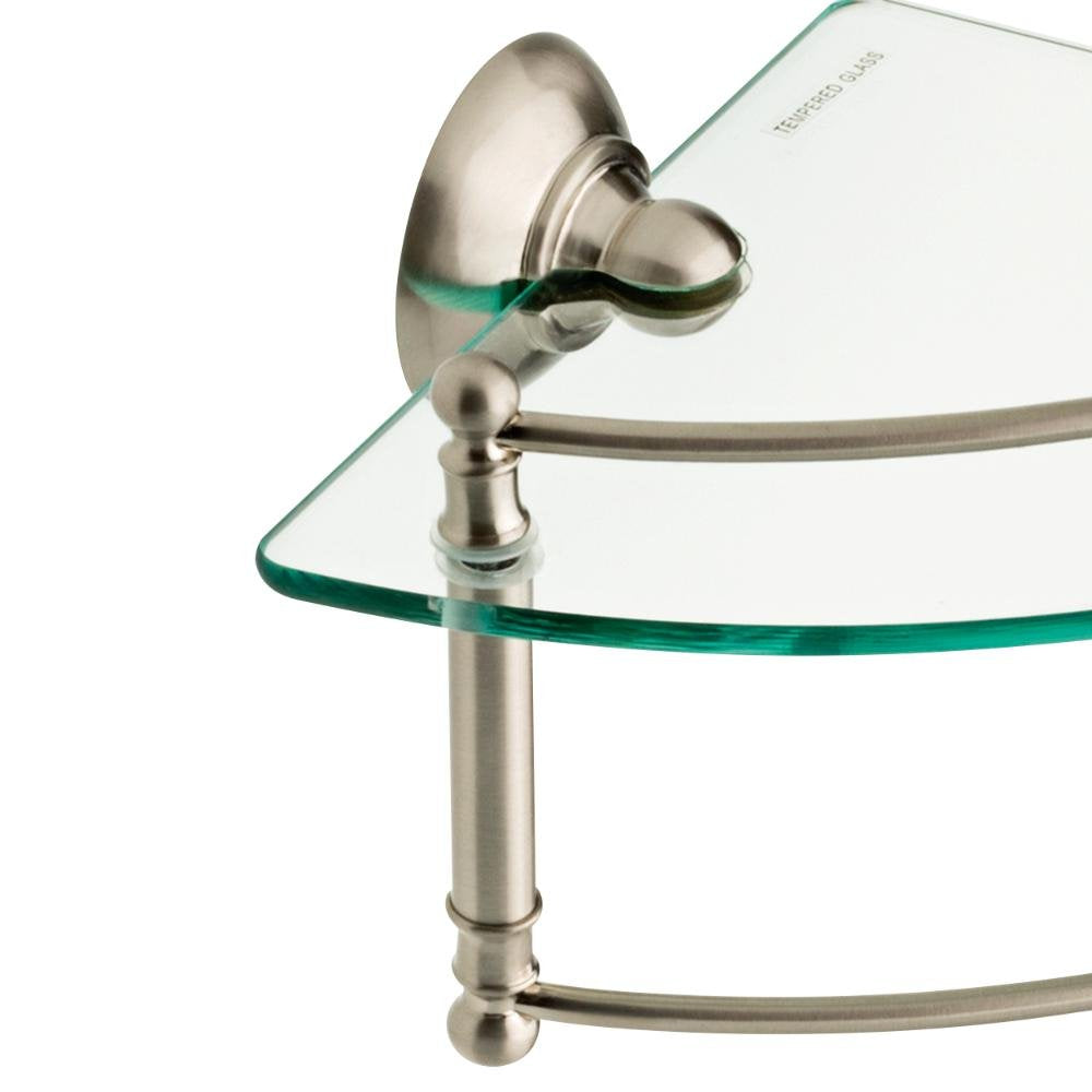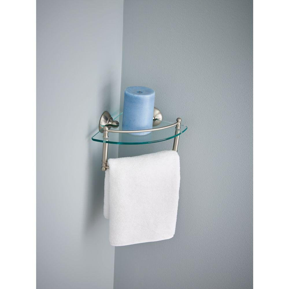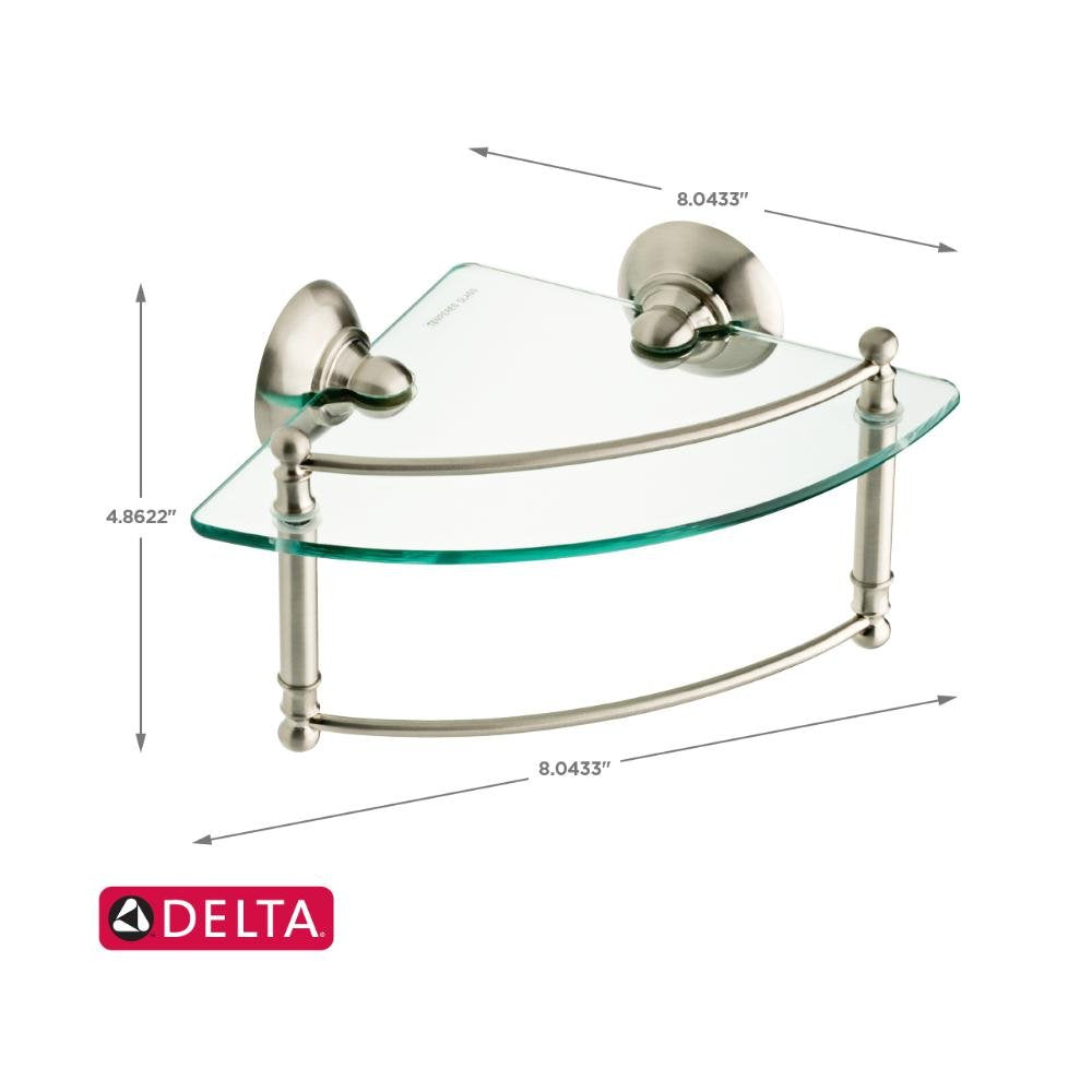 Designed to offer additional storage where its needed most without sacrificing design, this Delta Corner Shelf is a must have for baths with limited vanity space. The integrated design also offers a hand towel bar for concise bathroom organization. The towel bar holds one hand towel so no need to clutter wall space with a separate shelf and towel ring. The Brushed Nickel finished coordinates with all Nickel bath hardware families. Maximize your space with coordinating extension pieces from Delta. Wall mounted design for bathroom convenience and organization Has durable, long-lasting finish to help prevent corrosion, tarnish or discolor, so you can enjoy a look you love for life SpotShield technology resists water spots, fingerprints and stains so the bath hardware stays cleaner longer Zinc die cast construction provides reliability and durability Utilize that corner space with this shelf that's perfect for holding bath amenities such as candles, bottles and more while keeping one hand towel within reach Designed to coordinate with other Delta bath hardware accessories (towel bars, towel rings, robe hooks) and faucets in chrome Features set screw mounting system for added durability Mounting hardware and guide included to make installation easy