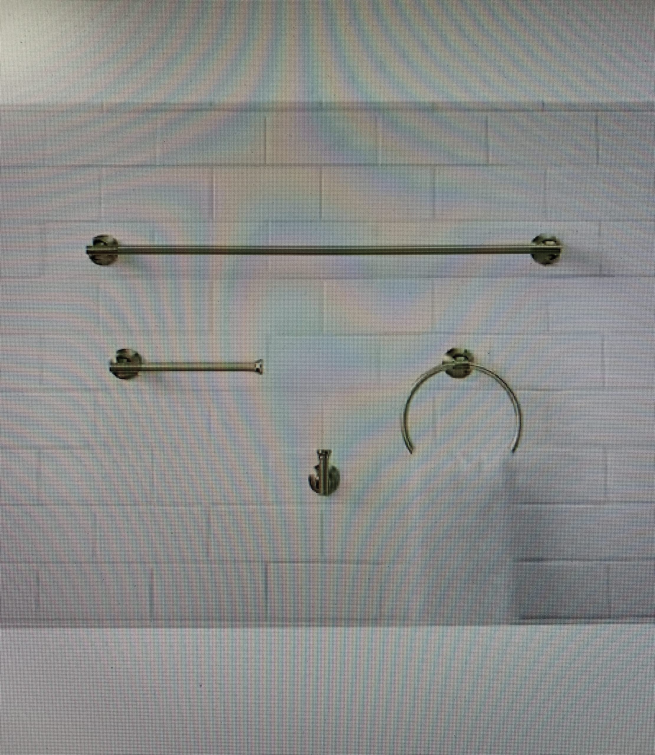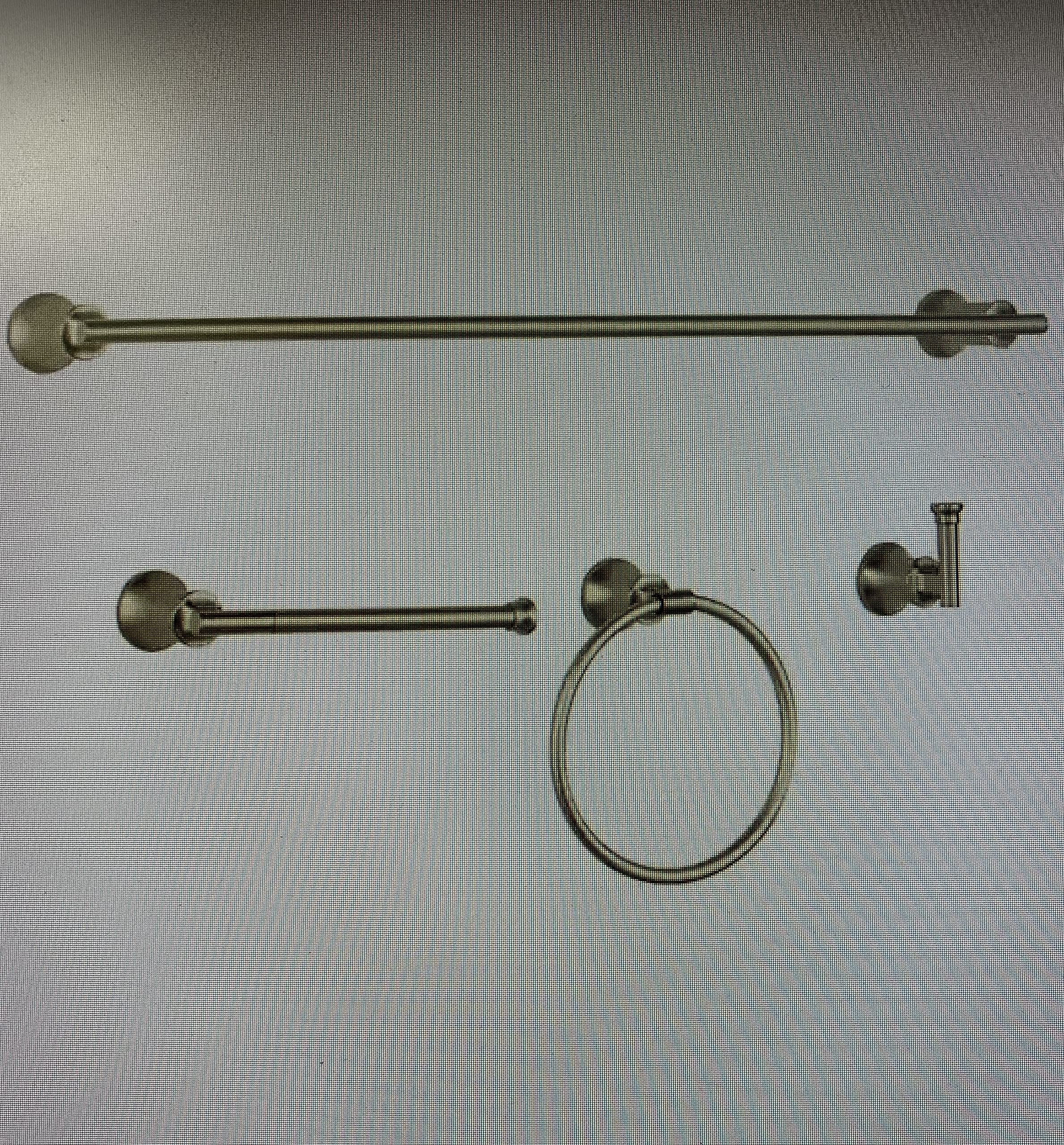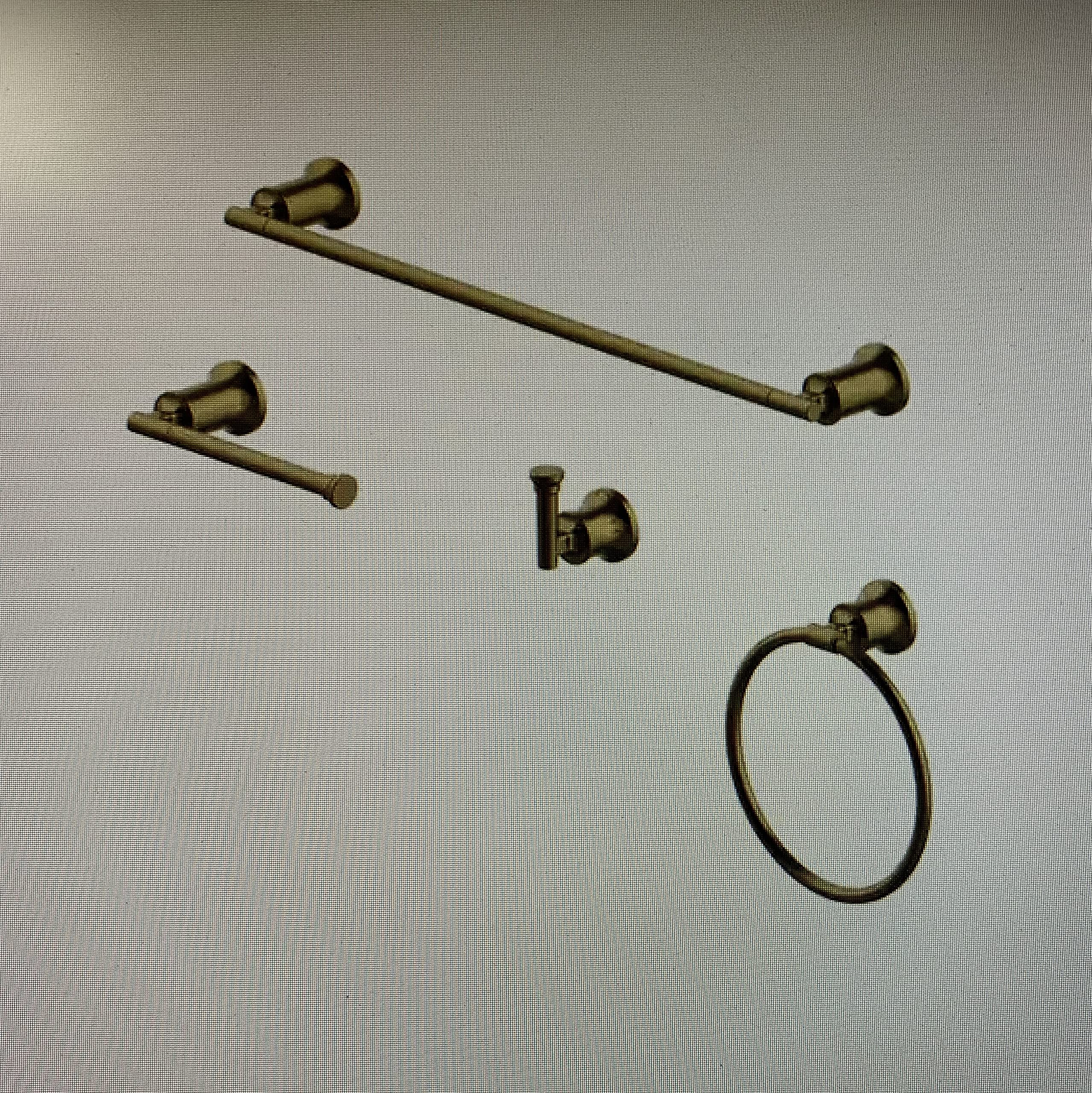 Finish the theme in your bathroom in a beautiful way with the simple and sleek Oswell 4-Piece Bathroom Accessory Kit from Glacier Bay. The kit is all-inclusive with the mounting hardware and plastic anchors for easy installation of the towel bar, Toilet Paper Holder, Towel Ring and Robe Hook. The towel bar Mix and match with other pieces from the Oswell collection too. Matte gold finish uses a physical vapor deposition process that ensures the finish is a durable lifetime finish Coordinates with other pieces in the collection for a complete, matching look Includes 24 in. towel bar, toilet paper holder, towel ring and robe hook Mounting hardware included for easy installation Backed by limited lifetime warranty