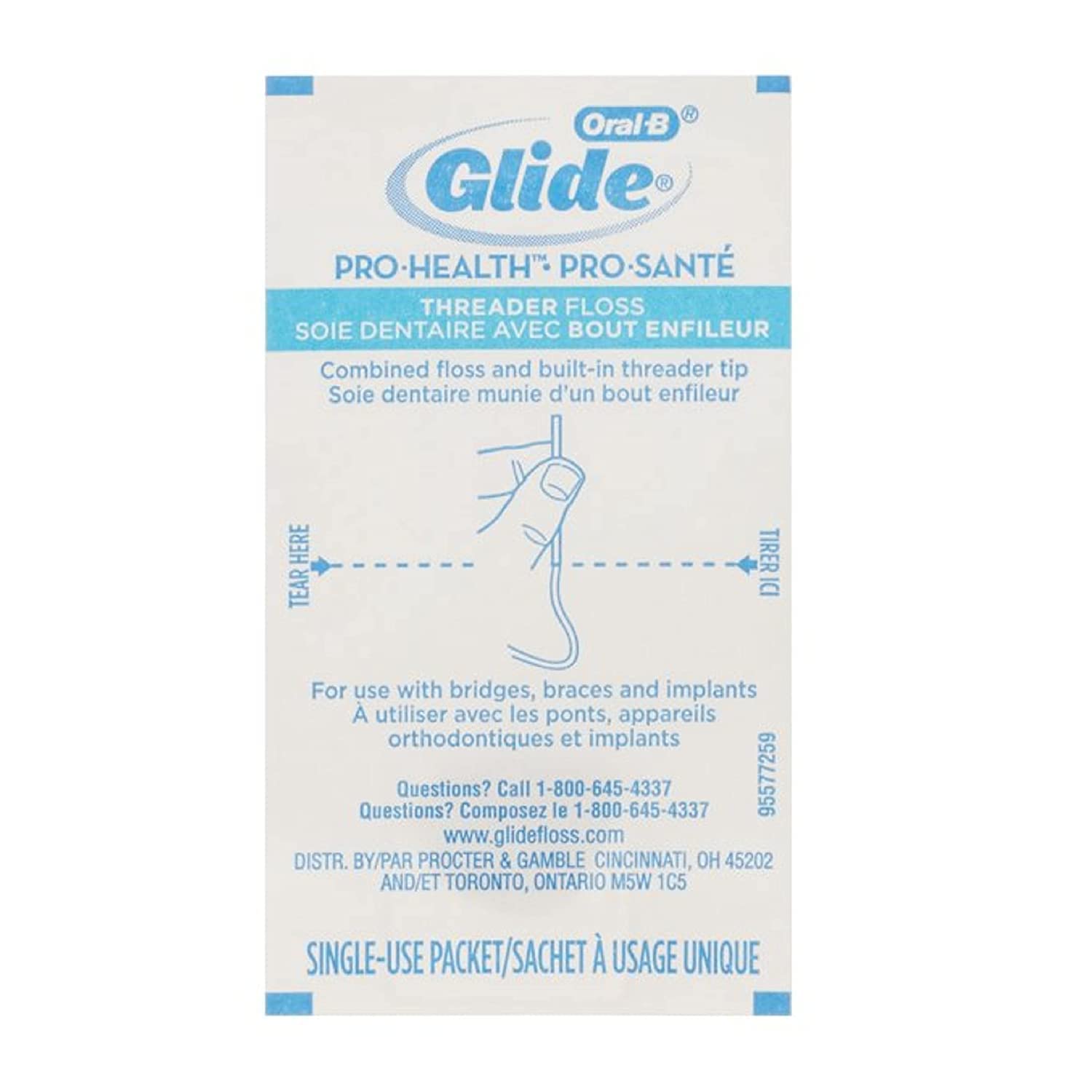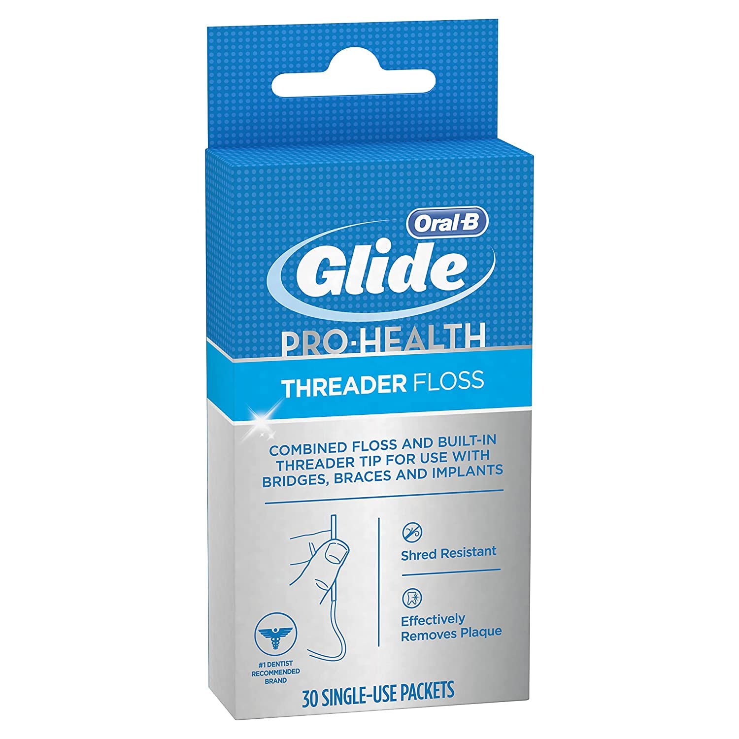 Effortlessly clean between teeth: Oral-B Glide Pro-Health Threader Floss combines floss and a built-in threader that effectively removes tough particles between teeth and just below the gum line. This makes it easier than ever to floss effectively, even if you have braces, bridges, or implants.