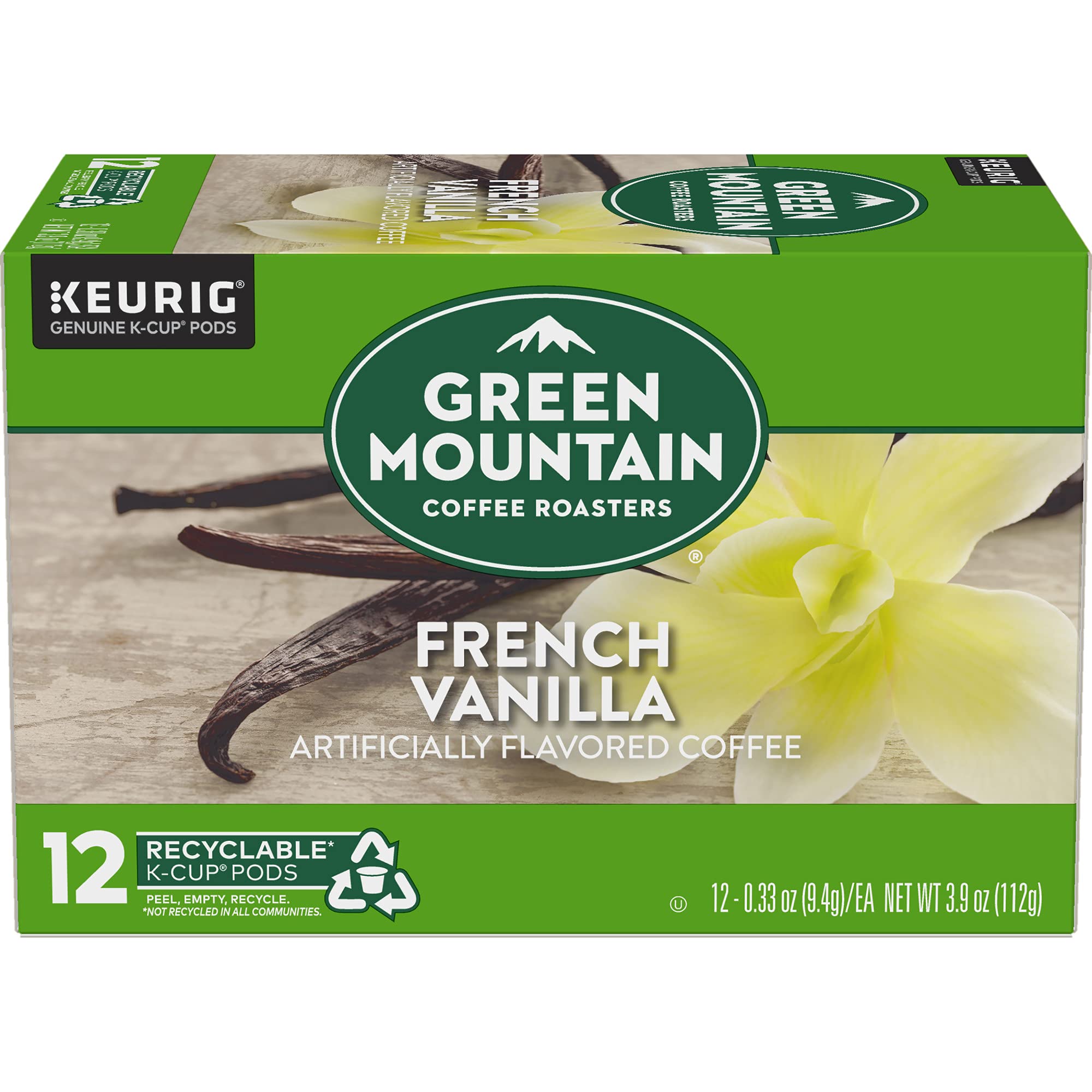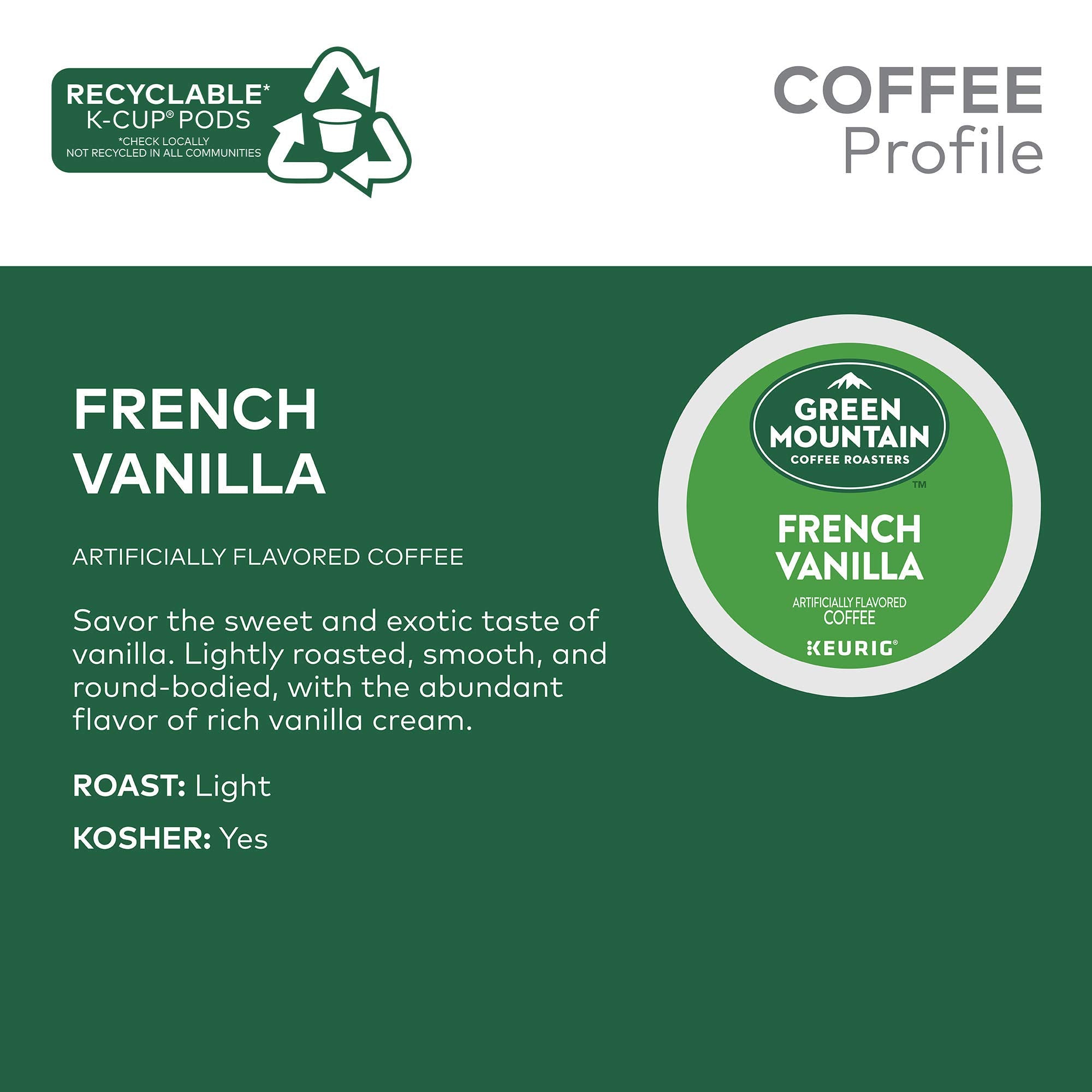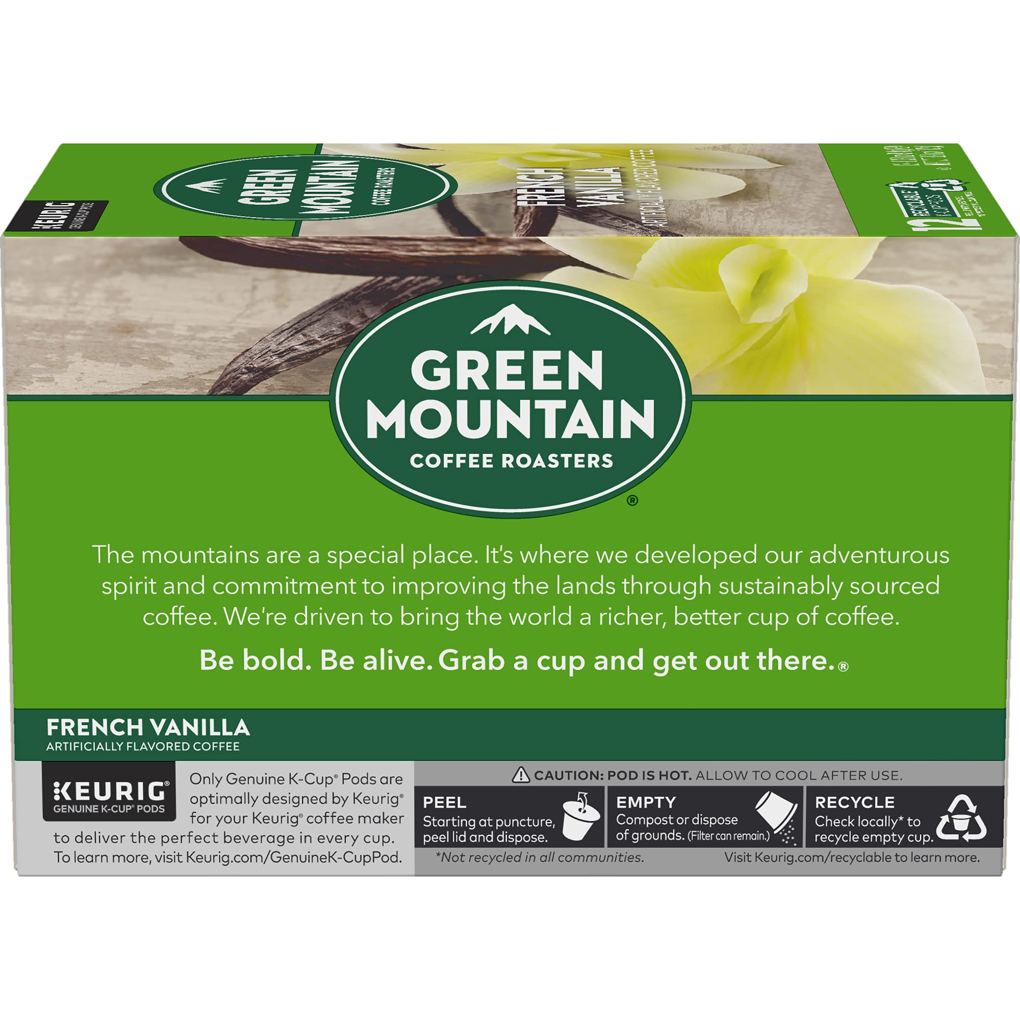 The mountains are a special place. It's where Green Mountain Coffee Roasters was born. It's where we developed our adventurous spirit and commitment to improving the lands through sustainably sourced coffee. We're driven to bring the world a richer, better cup of coffee. Be bold. Be alive. Grab a cup and get out there. Savor the sweet and exotic taste of vanilla with the Green Mountain Coffee Roasters French Vanilla. Lightly roasted, smooth, and round-bodied, with the abundant flavor of rich vanilla cream. These single-serve K-Cup pods are compatible with all Keurig K-Cup Pod Single-Serve Coffee Makers. Each K-Cup pod is filled with the freshest ground coffee and brews a perfect, great tasting cup of coffee, every time. Certified Orthodox Union Kosher. What does being 100% responsibly sourced coffee mean? Responsibly Sourced means the coffee we purchase is grown and sold in adherence to a credible sourcing program that aligns with our company Responsible Sourcing Guidelines. Our coffee is 100% responsibly sourced.