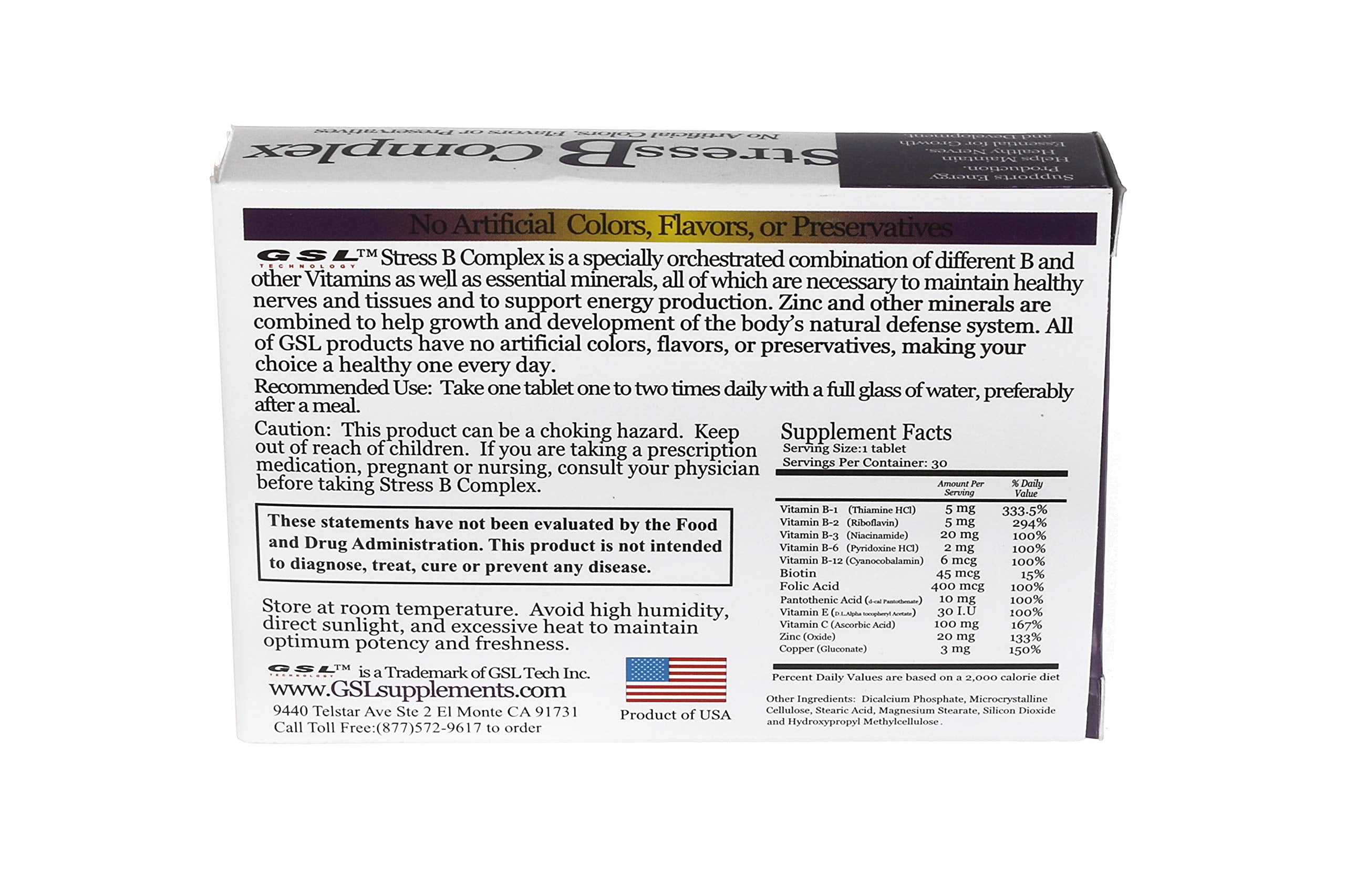 Stress B Complex is a specially orchestrated combination of different B and other Vitamins as well as essential minerals, all of which are necessary to maintain healthy nerves and tissues and to support energy production. Zinc and other minerals are combined to help growth and development of the body's natural defense system. All of GSL products have no artificial colors, flavors, or preservatives, making your choice a healthy one every day.