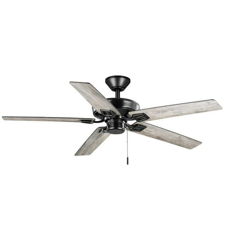 The 52 in. Bayfield ceiling fan from Hampton Bay offers an easy way to enhance your indoor living space. The stark matte black finish is complemented by 5 reversible blades in matte black and pecan heather finishes to blend with your decor. Built for year-round comfort the Bayfield boasts a quiet 3-speed reversible motor and is controlled via the pull chain to operate the fan s 3 speeds. This versatile fan is light kit adaptable and compatible with universal remote controls or wall switches to give you a variety of installation options.