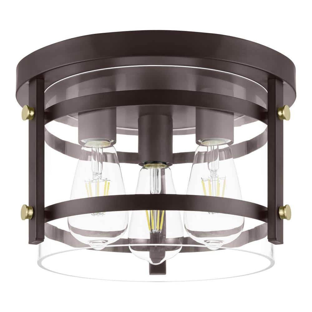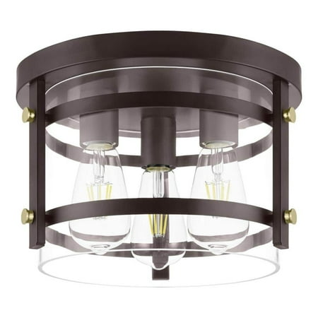 Flush mount lighting is the easiest way to illuminate a space with style. In all its stunning glory the Huxley Flush Mount Ceiling Light encompasses contemporary design while offering a rustic contemporary look. Geometric lines combine with dark bronze sockets and brass hardware to truly flush out the rustic element while the clear glass shade and exposed bulbs bring the contemporary feel. Simply add vintage Edison bulbs to complete the look.