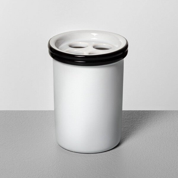 This Stoneware Toothbrush Cup White/Black from Hearth & Hand™ with Magnolia lets you bring practical style to your interiors. Constructed from stoneware for sturdy, long-lasting use, this black and white holder provides a stylish yet practical way for you to store your everyday essentials. Perfect for your bathroom vanity space, you can pair it with coordinating holders and boxes for a complete, cohesive look. Celebrate the everyday with Hearth & Hand — created exclusively for Target in collaboration with Magnolia, a home and lifestyle brand by Chip & Joanna Gaines. Built upon our shared commitment to giving back to our communities, these pieces reveal the beauty of everyday moments shared with family and friends.