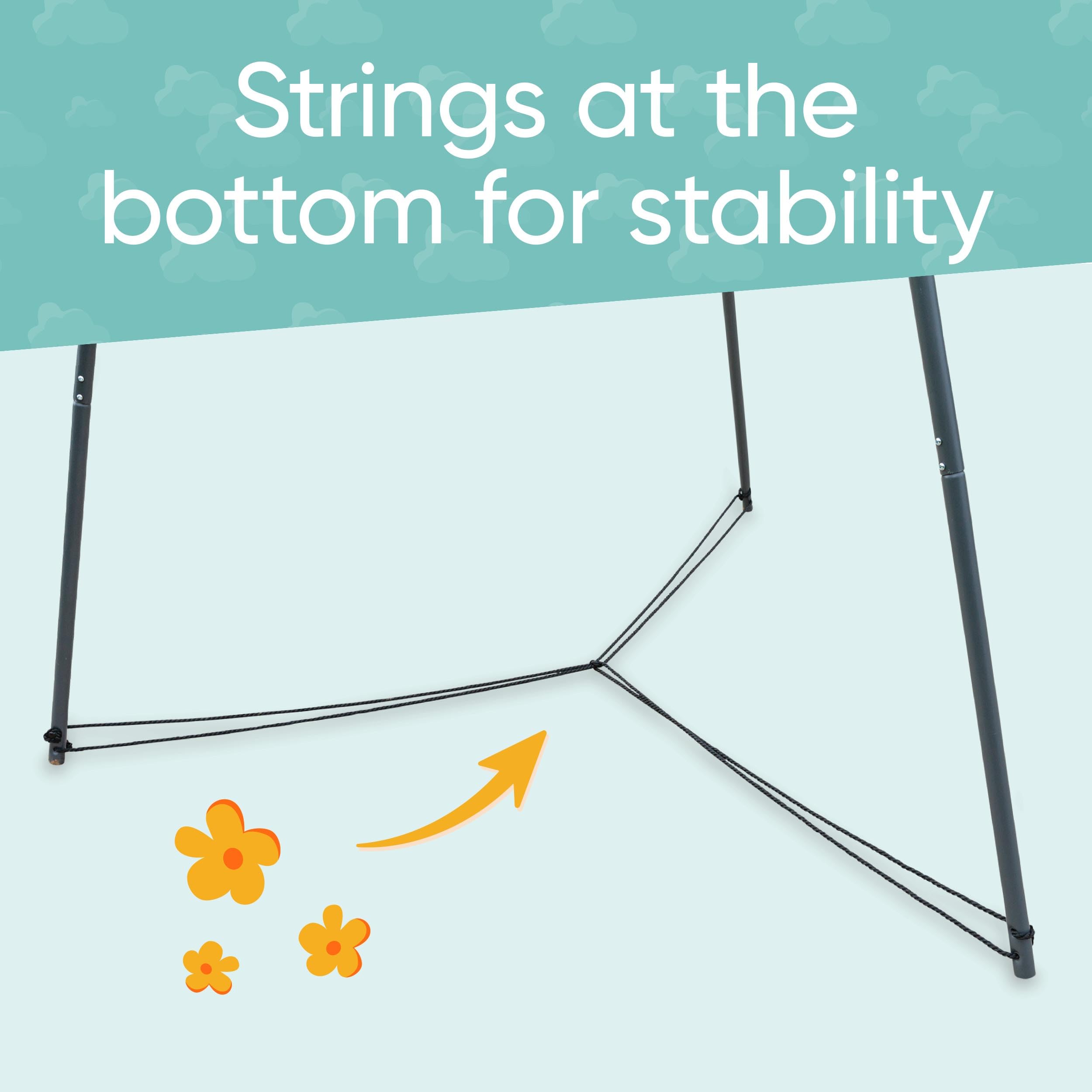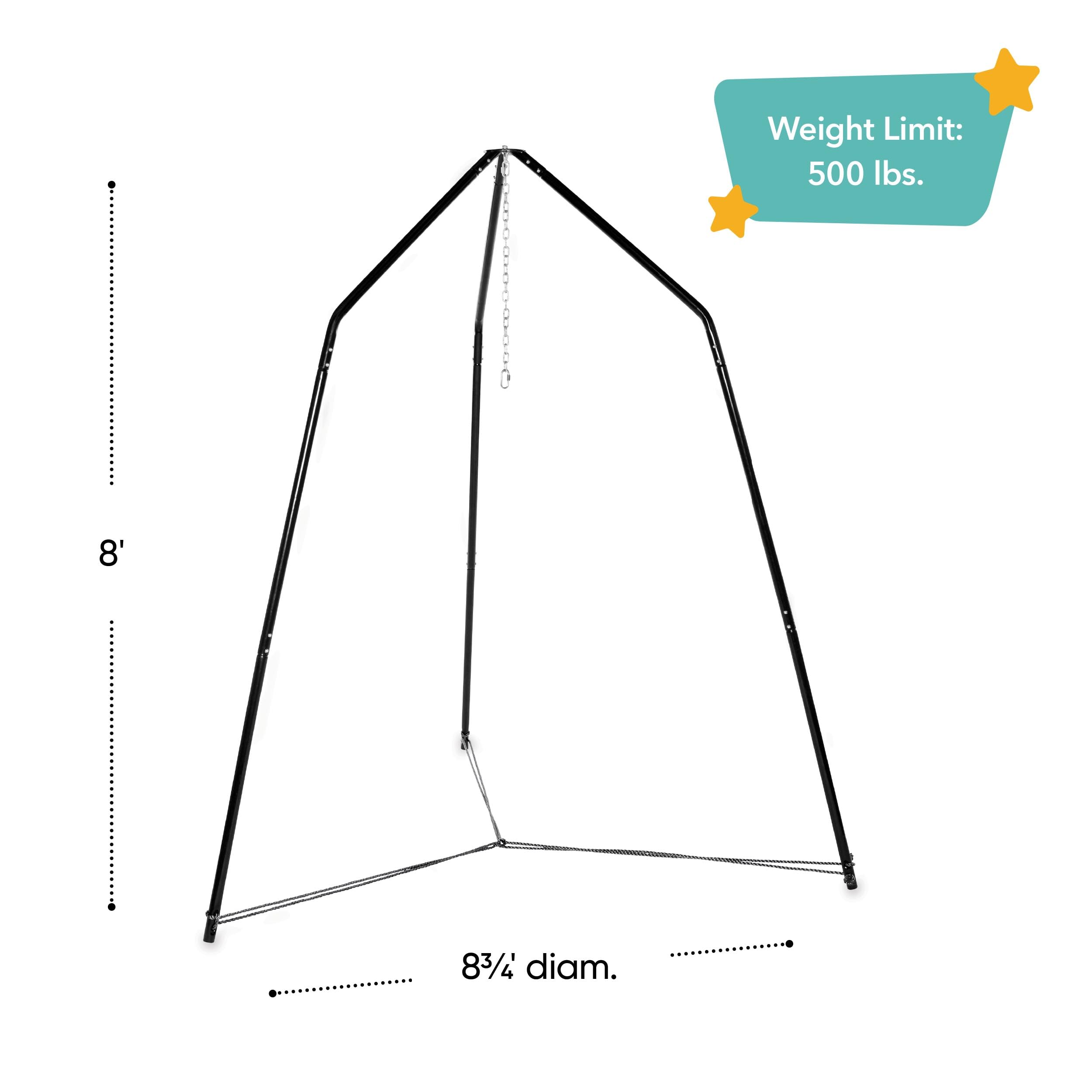Custom crafted sturdy metal stand for hanging chairs and tents Extra-large stand is 8.75'L x 8.75'W x 8'H and holds up to 500 lbs. Exclusively designed to hang our Family HugglePod HangOut, or any other HugglePod or HangOut, outdoors Not recommended for use with swings Adult assembly required; hanging hardware included.