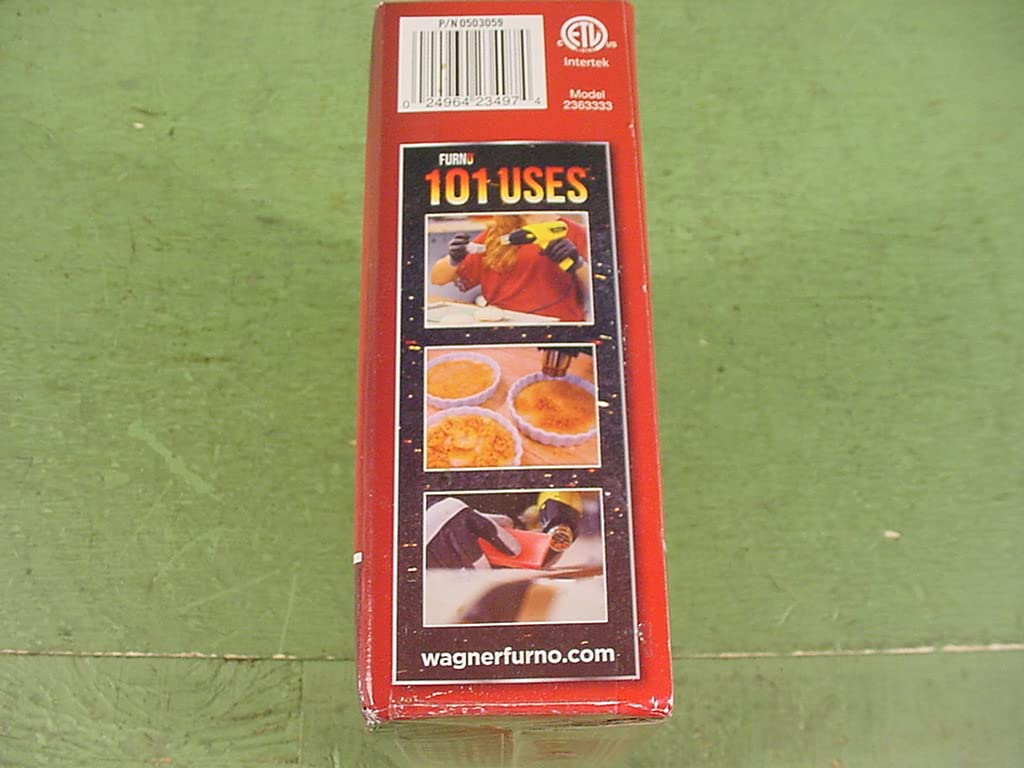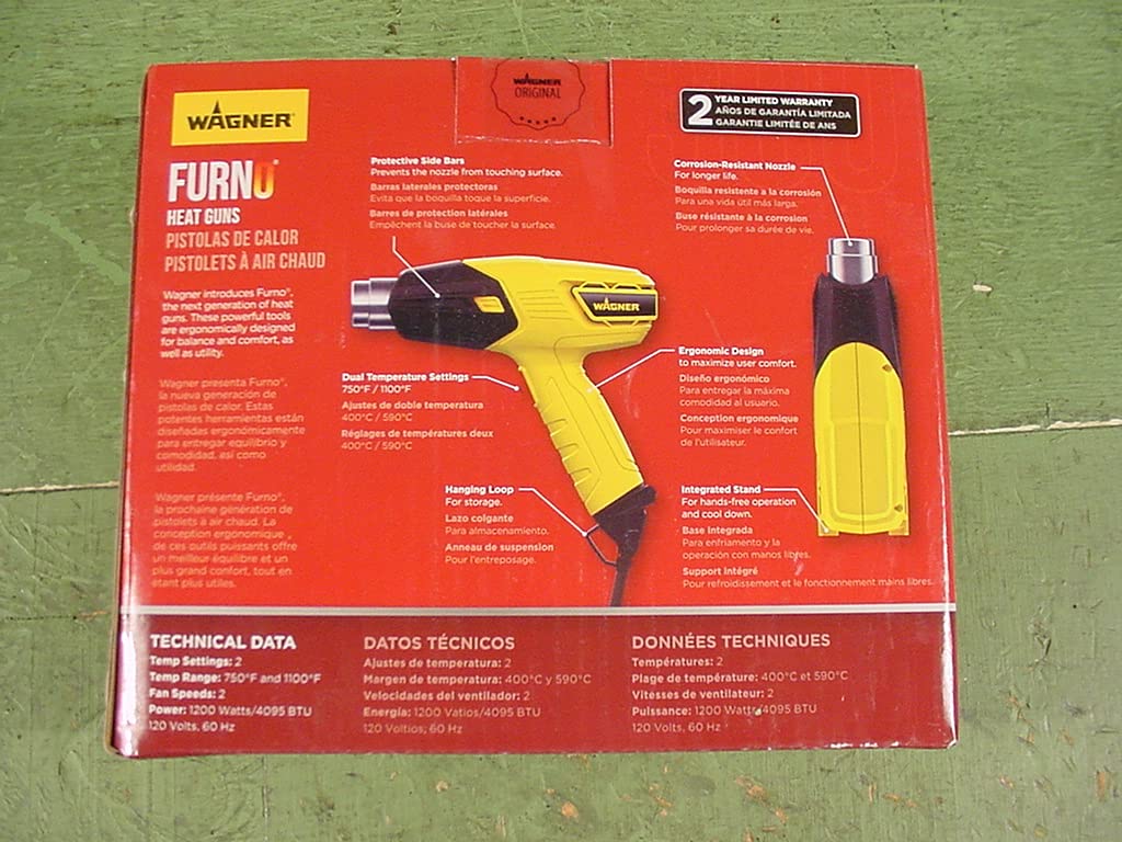 FURNO300 1200W Heat Gun The Wagner Furno 300 Dual Temperature Heat Gun is an affordable heat gun that can be used for dozens of applications that require heat. Ideal for projects such as loosening rusty bolts, waxing a surfboard, defrosting the freezer, desoldering pipes, insulating windows and bending PVC pipes. Brand: Wagner Sub Brand: Furno 300 Amps: 10 Amps Watts: 1200W Volts: 120V Heat Gun Type: Dual Temperature Product Type: Heat Gun Packaging Type: Box Corded or Cordless: Corded Max Temperature : 1100°F BTU Heat Rating: 4100 BTU Minimum Temperature: 750°F Cord Length: 6-1/2 feetSeller Note: This Item has been tested and it does work and inspected.