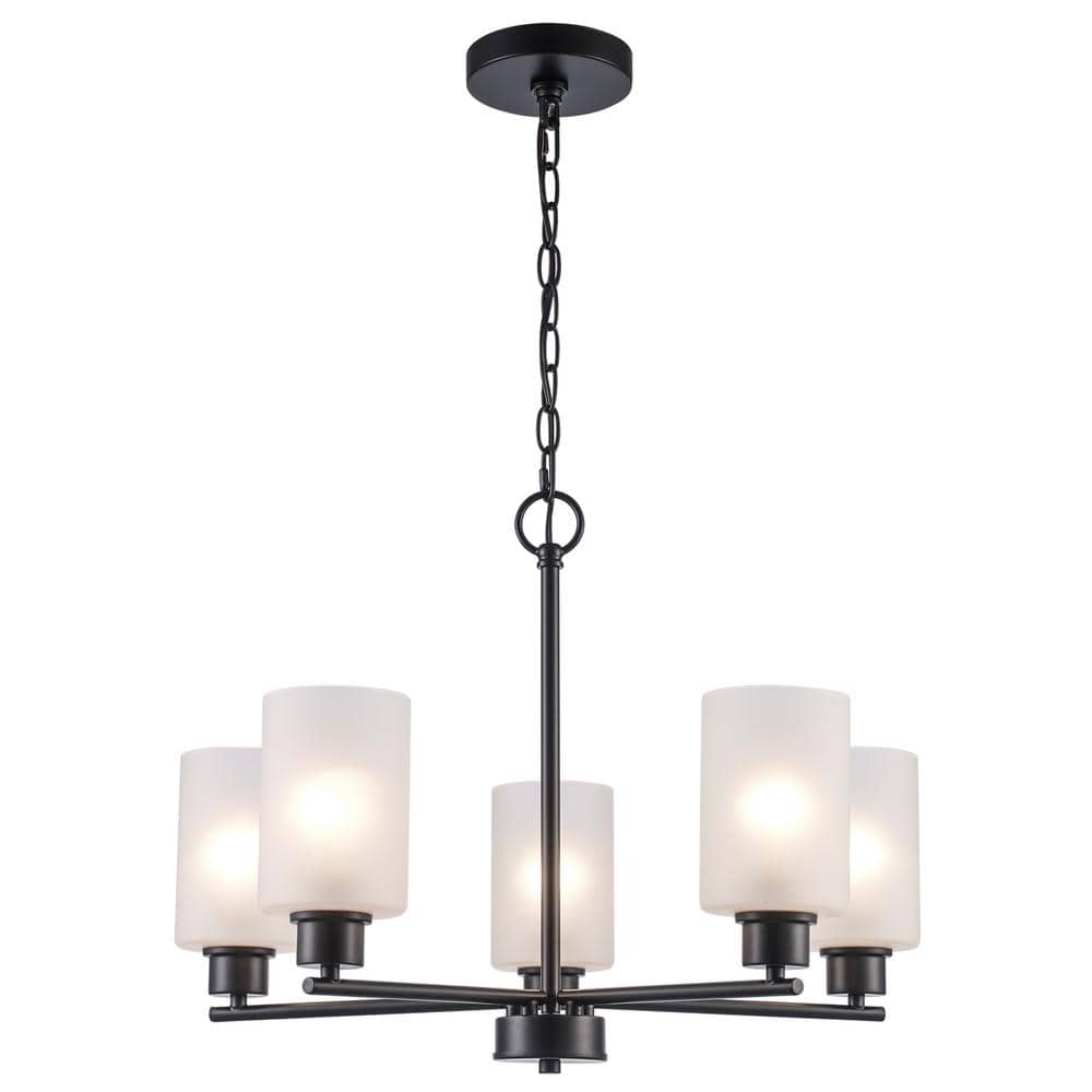 The Heath Collection chandelier from Monteaux Lighting is a contemporary indoor light fixture, designed to suit a variety of home decor styles from transitional to modern farmhouse. The decorative hanging ceiling light will work well as a kitchen light fixture, dining room light, foyer chandelier, and more. The light is constructed of black-finished metal and includes a circular ceiling plate and a traditional chandelier shape with five arms that extend from a central support rod and hold the glass shades in place. The frosted glass shades have a cylinder shape, house a single light bulb in each, and are open at the top for easy access to change the bulbs. The chandelier body hangs from a matching black chain, allowing for an adjustable height and sloped ceiling compatibility.