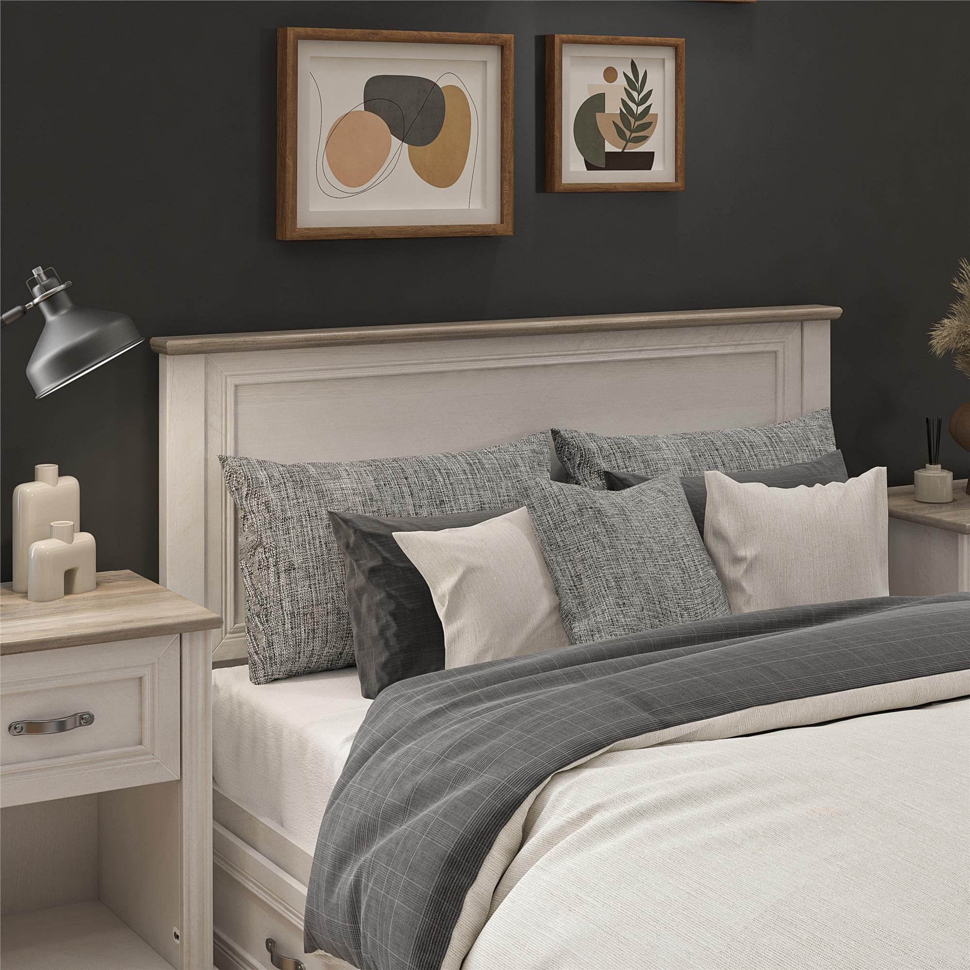 Add a classic touch to your bedroom with the Ameriwood Home Hillview Full Headboard. Made from of the laminated MDF and particleboard, the ivory woodgrain finish with gray oak top adds an elegant touch and fits into any dcor. The Headboard has multiple predrilled holes that accommodate many full bed frames. The molding on the face of the Headboard adds a decorative touch. The Ameriwood Home Hillview Full Headboard ships flat to your door and 2 adults are recommended for assembly. Once assembled, the Headboard measures to be 56.77" W x 3.11" D x 40.39" H. The Ameriwood Home Hillview Full Headboard adds a classic touch to your bedroom Two toned Ivory woodgrain finish with gray oak top constructed from laminated MDF and particleboard Headboard equipped with multiple predrilled holes to accommodate many full sized bed frames Decorative molding on the face of the Headboard adds a sophisticated touch Complete your bedroom with the Hillview Nightstand, 4 Drawer Dresser, 6 Drawer Dresser (each sold separately) SKU: 1625500EBL Product Dimensions: 3.11 x 40.39 x 56.77 in. Shipping Dimensions: 61.25 x 2.5 x 20.81 in. Unit Weight : 35 lbs Carton Weight : 38 lbs Documents: Assembly Manual Functional Drawings Assembly Manual Functional Drawings