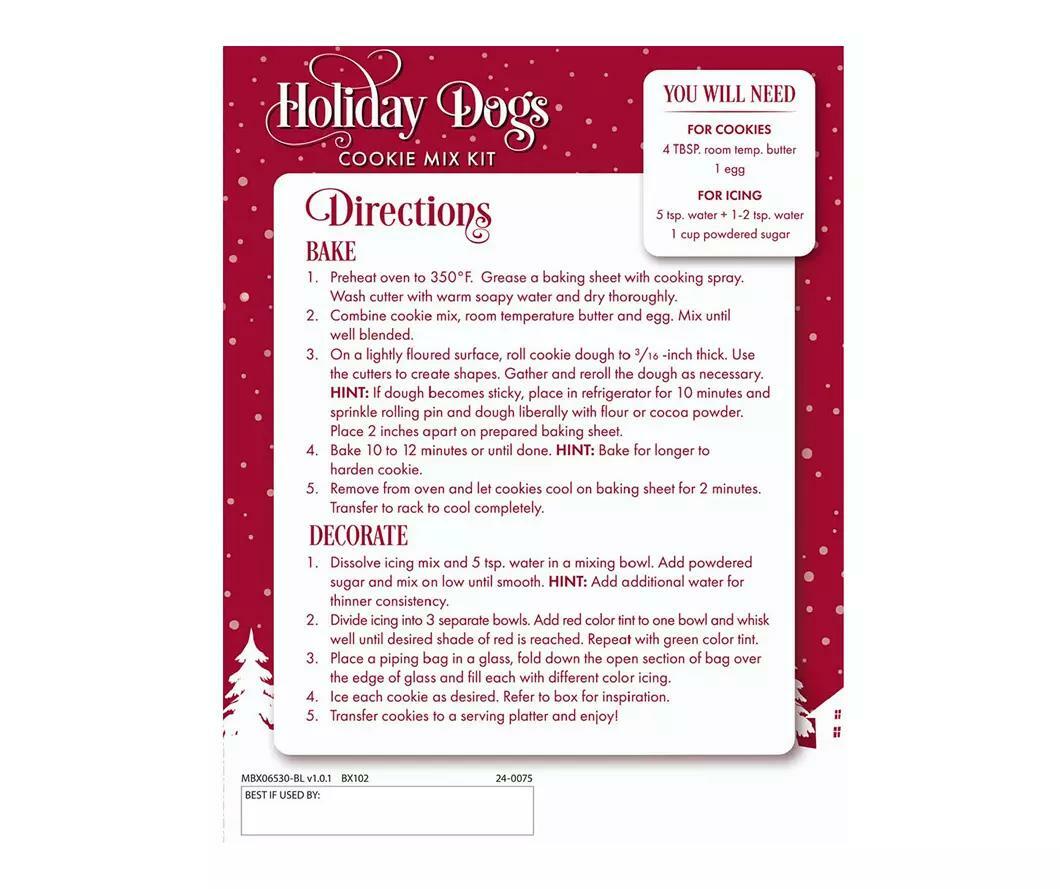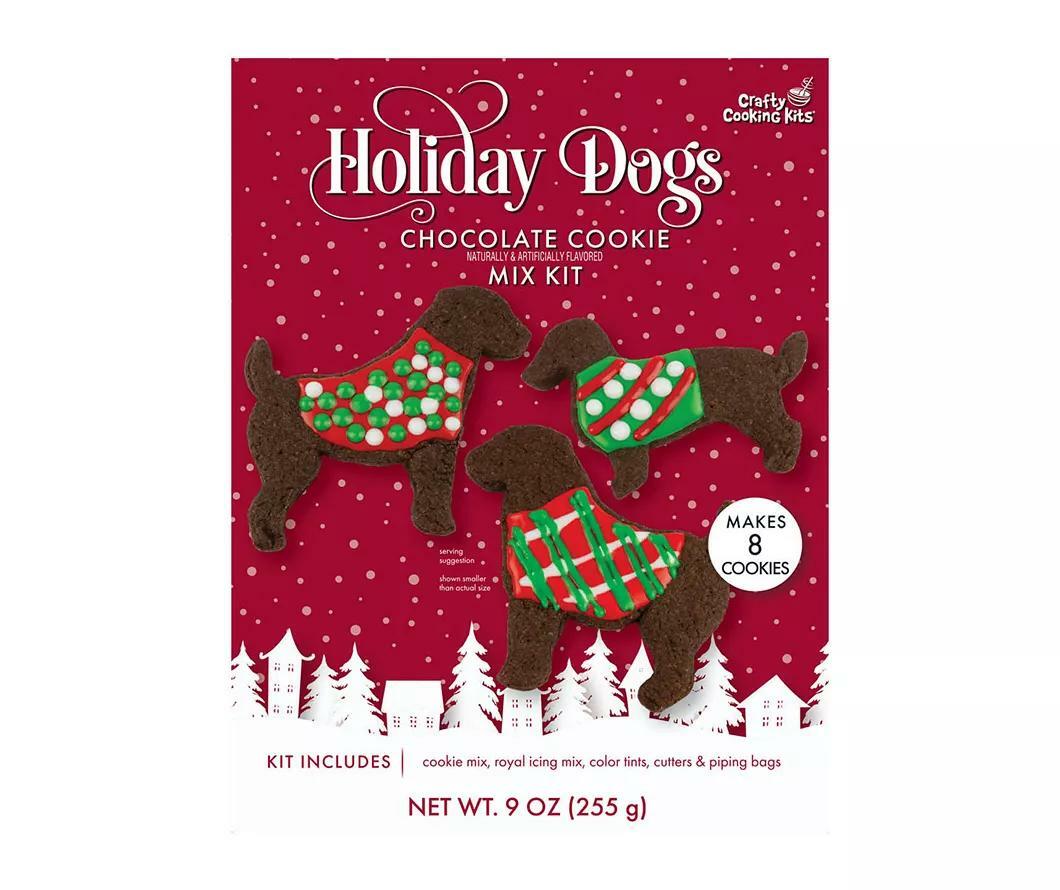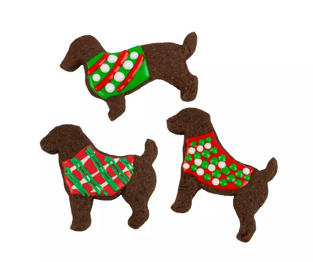 Usher in the Christmas season with these festive chocolate cookies shaped like dogs. Scrumptious chocolate cookies come with plenty of decorative frosting options and a dog shaped cookie cutter for an unforgettable holiday treat.